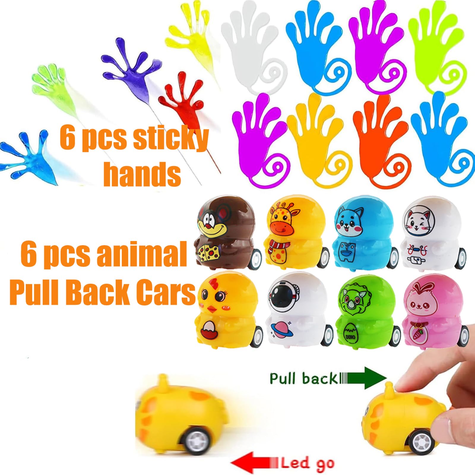 Details: The 124 pieces kids' party favor sets contains a rich variety of small toys that allow children to interact and play at parties, including:2 animal pop keychains, 3 cute pop keychains, 3 pop bracelets, 6 random shape mini pop keychains, 60 Stickers, 8 fluffy toys, 2 finger spinners, 6 mochi squishies, 6 sticky hands, 6 animal Pull Back Cars, 6 Tumbler, 6 Pull Back Planes, 6 mini skateboard.