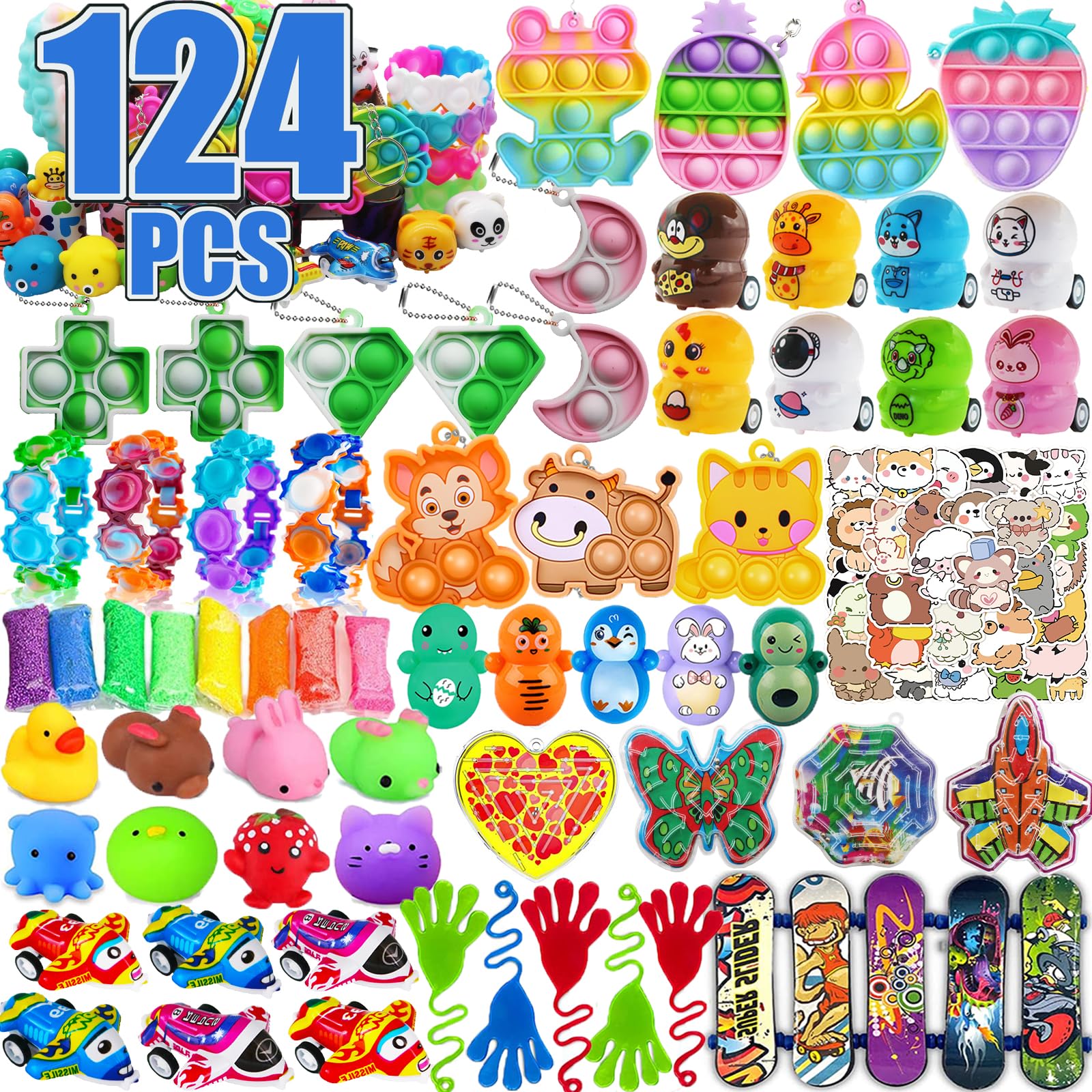- 【PARTY FAVORS FOR KIDS】The 124 pieces kids' party favor sets contains a rich variety of small toys that allow children to interact and play at parties, including:2 animal pop keychains, 3 cute pop keychains, 3 pop bracelets, 6 random shape mini pop keychains, 60 Stickers, 2 spinning toys, 8 Fluffy Toys, 4 Maze Puzzles, 6 mochi squishies, 6 sticky hands, 6 animal Pull Back Cars, 6 Tumbler, 6 Pull Back Planes, 6 mini skateboard.