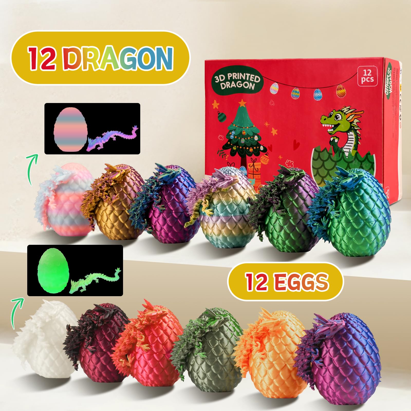 - Exquisite 3D Printed Dragon Egg Set:Each set contains 12 brightly colored 3D printed dragon eggs, each containing a 3D printed dragon with realistic scales and articulated joints. Each dragon is uniquely designed, making it a perfect addition to any collection or decoration.