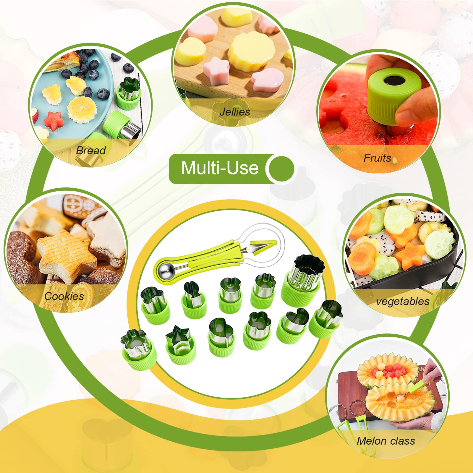 - Cost-effective Fruit Slicer Set: Our 15pcs Fruit Slicer Peeler Set will definitely bring you unexpected surprises. The set includes: 4-in-1 Stainless Steel Melon Baller Scoop Set, 3-in-1 Avocado Slicer, Orange Peeler, Fruit Vegetable peeler and 12pcs Fruit Cookie Cutter Set. A variety of tools will serve all your needs and provide you with countless possibilities