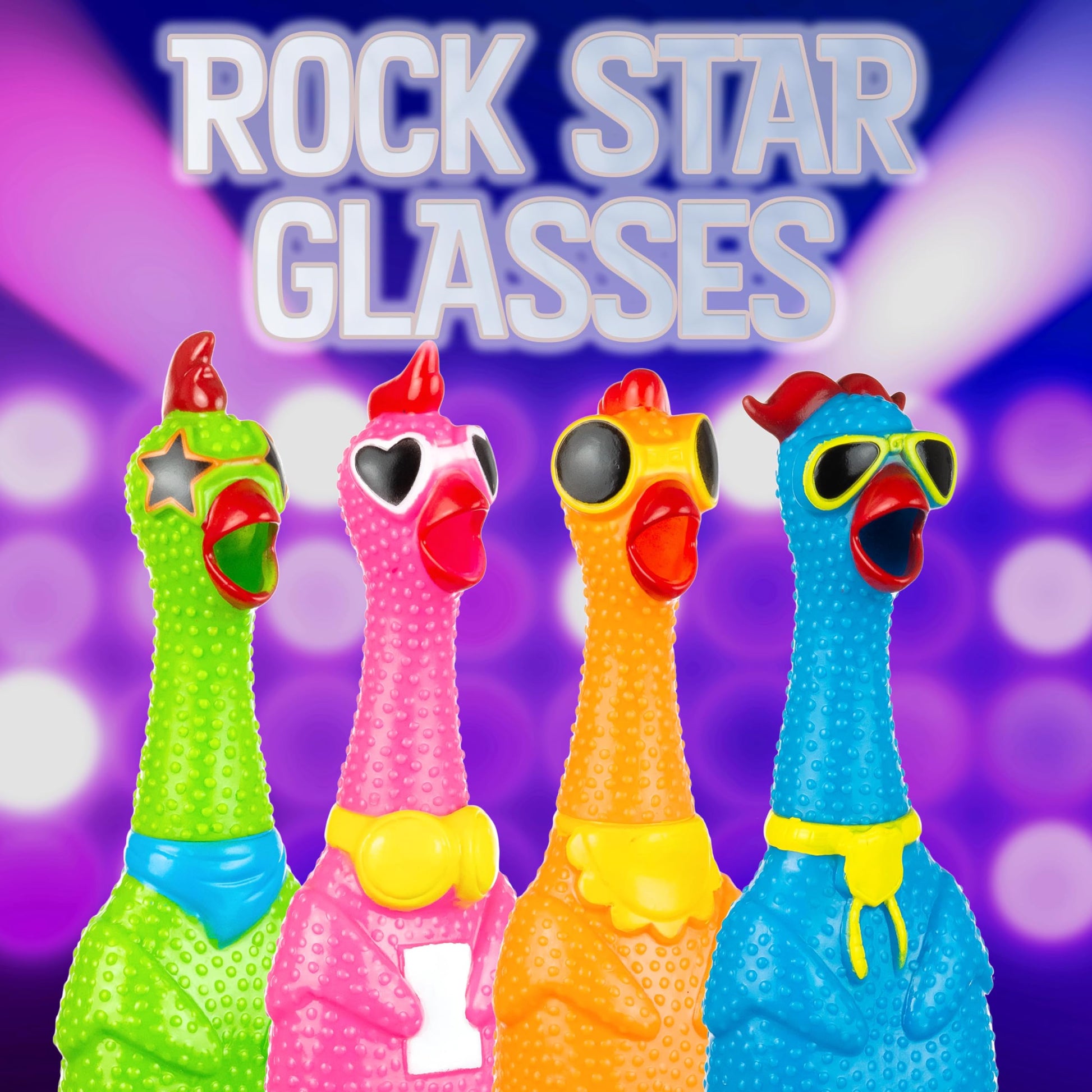 - Silly Screaming Chicken Design - This set includes 3 screaming rubber chickens to squish, squeeze, and play with; each rubber chicken is colorful and wears cool sunglasses, adding a fun twist to a classic toy
