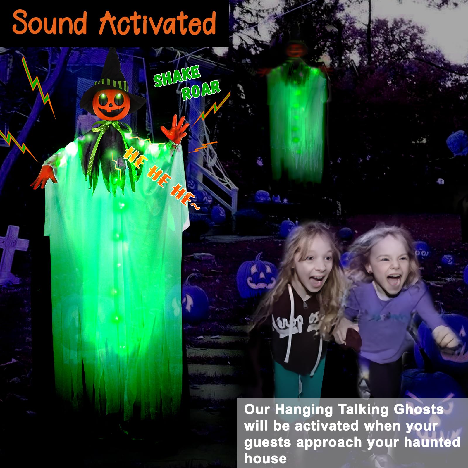 55” Halloween Hanging Animatronics Ghost Pumpkin with LED Lights, Sound & Motion Activated and Shaking Arms - Perfect for Halloween Haunted House Prop Décor, Indoor/Outdoor Display, Lawn, Party