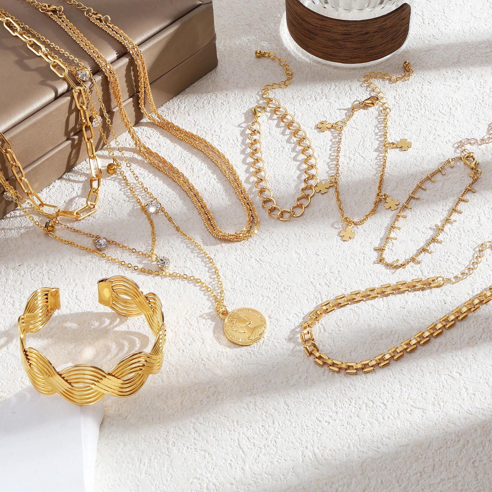 59 Pcs(8 Pack) Gold Plated Jewelry Set For Women With 8 Necklace 12 Bracelet 27 Ring 12 Pair Earring Hoop Simple Sparkle For Happy