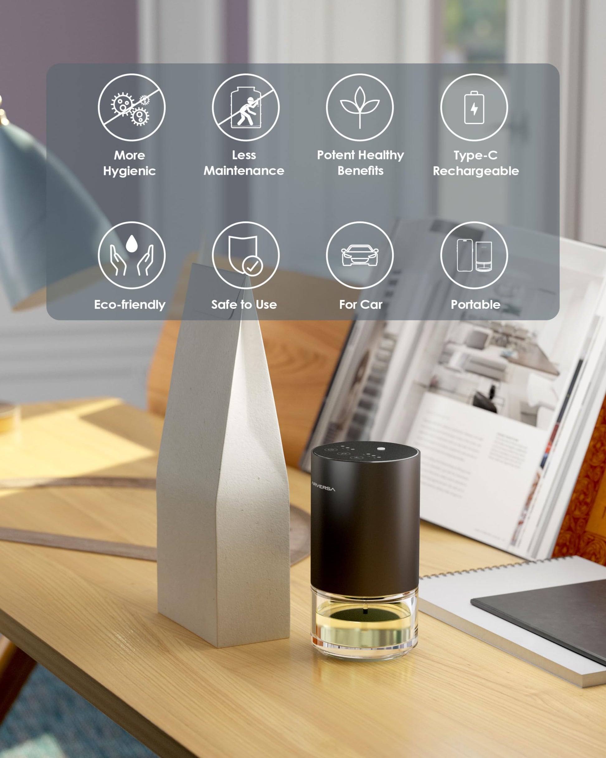 Airversa Essential Oil Diffuser Waterless Aromatherapy Diffusers for Home Large Room, Bedroom, Car, Office, Desk, Battery Operated, Small Diffuser for Pure Scent, 100mL Capacity, AN9 (Black)