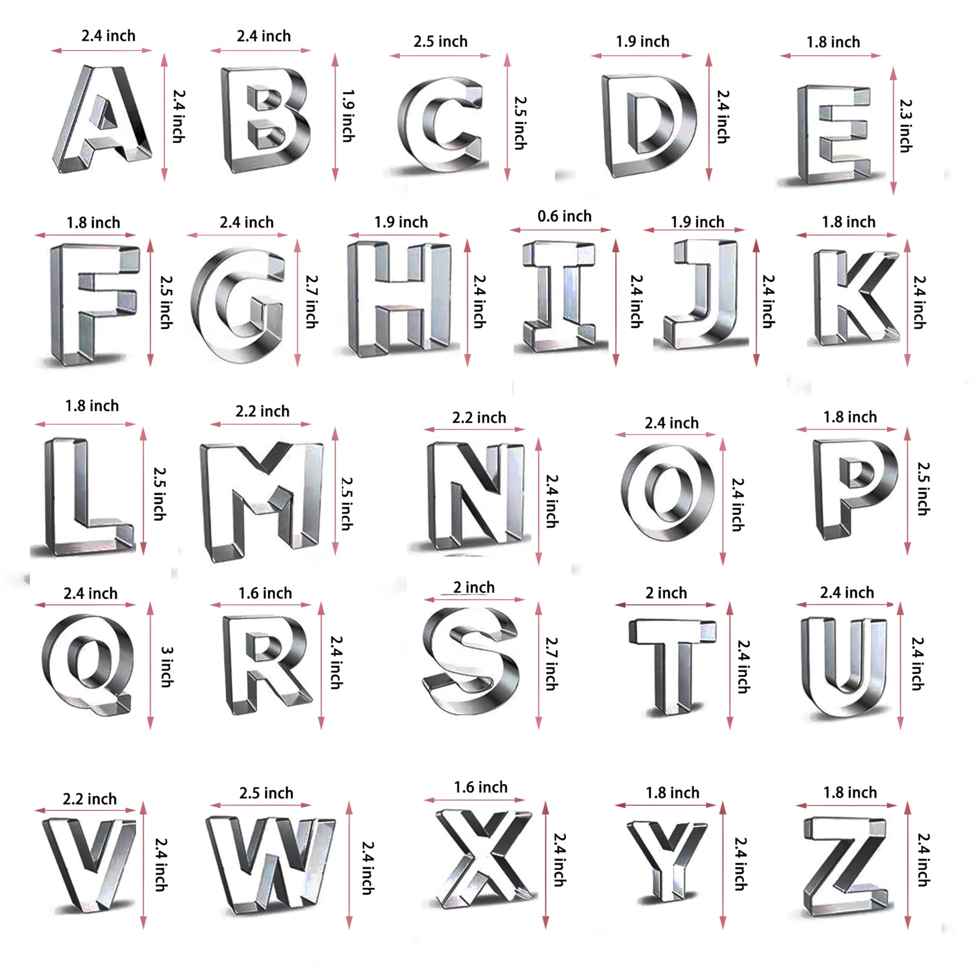 - Alphabet Letters Cookie Cutter Set:This set of cookie cutters includes 26 capitalized letter shapes (A B C D E F G H I J K L M N O P Q R S T U V W X Y Z).They are great for birthday, valentine's day, wedding, easter, baby shower, halloween, thanksgiving, christmas , any holiday and anniversary or other celebrations. Get ready for your party cookie decorations with this funny set.