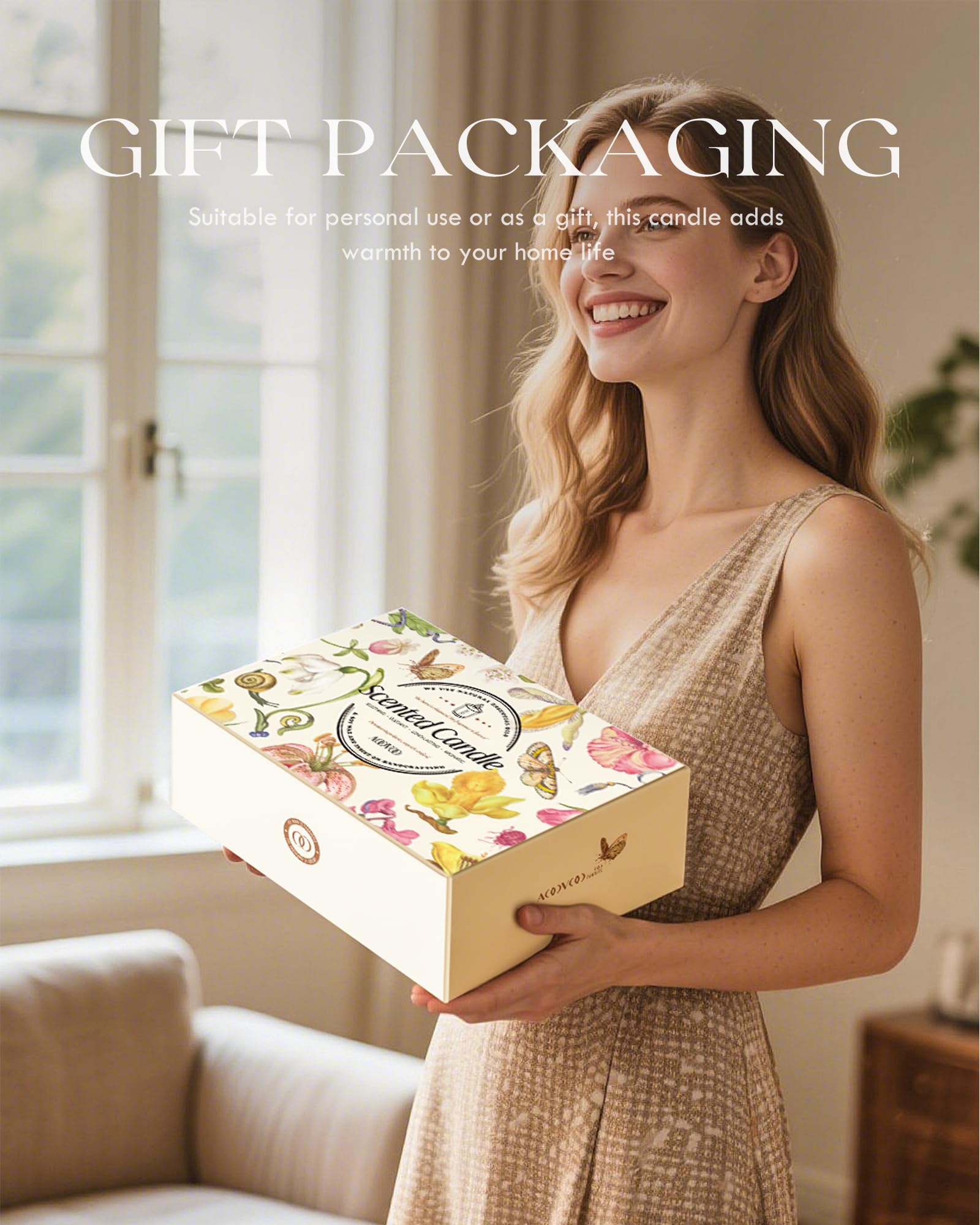 - Perfect for Gifting: No extra wrapping needed. Presented in an elegant gift box with beautifully crafted glass jar candles and gold foil labels, boasting an array of delightful scents that make this gift truly special.