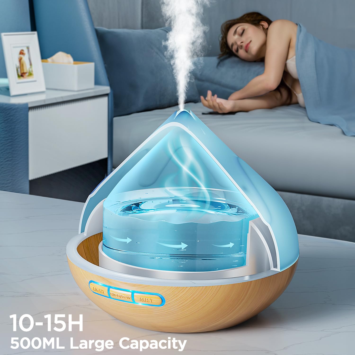 - LARGE CAPACITY AROMA DIFFUSER: Our essential oil diffuser capacity is 500 ML; it is perfect for large rooms; this diffuser is also includes 7 ambient light chose to create a relaxing atmosphere to your room and make your life more colorful.