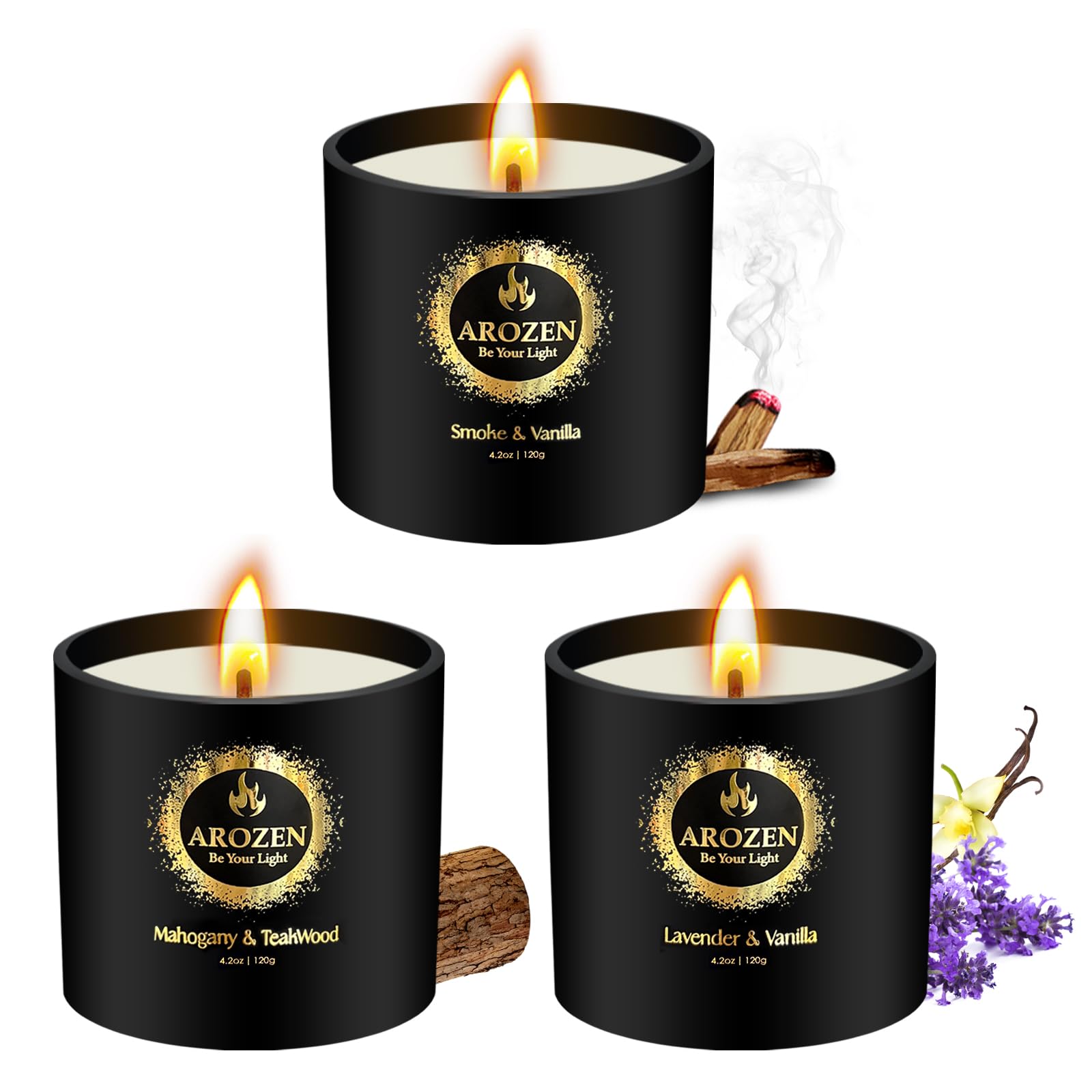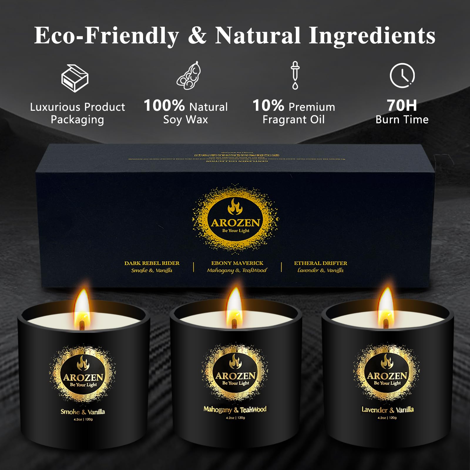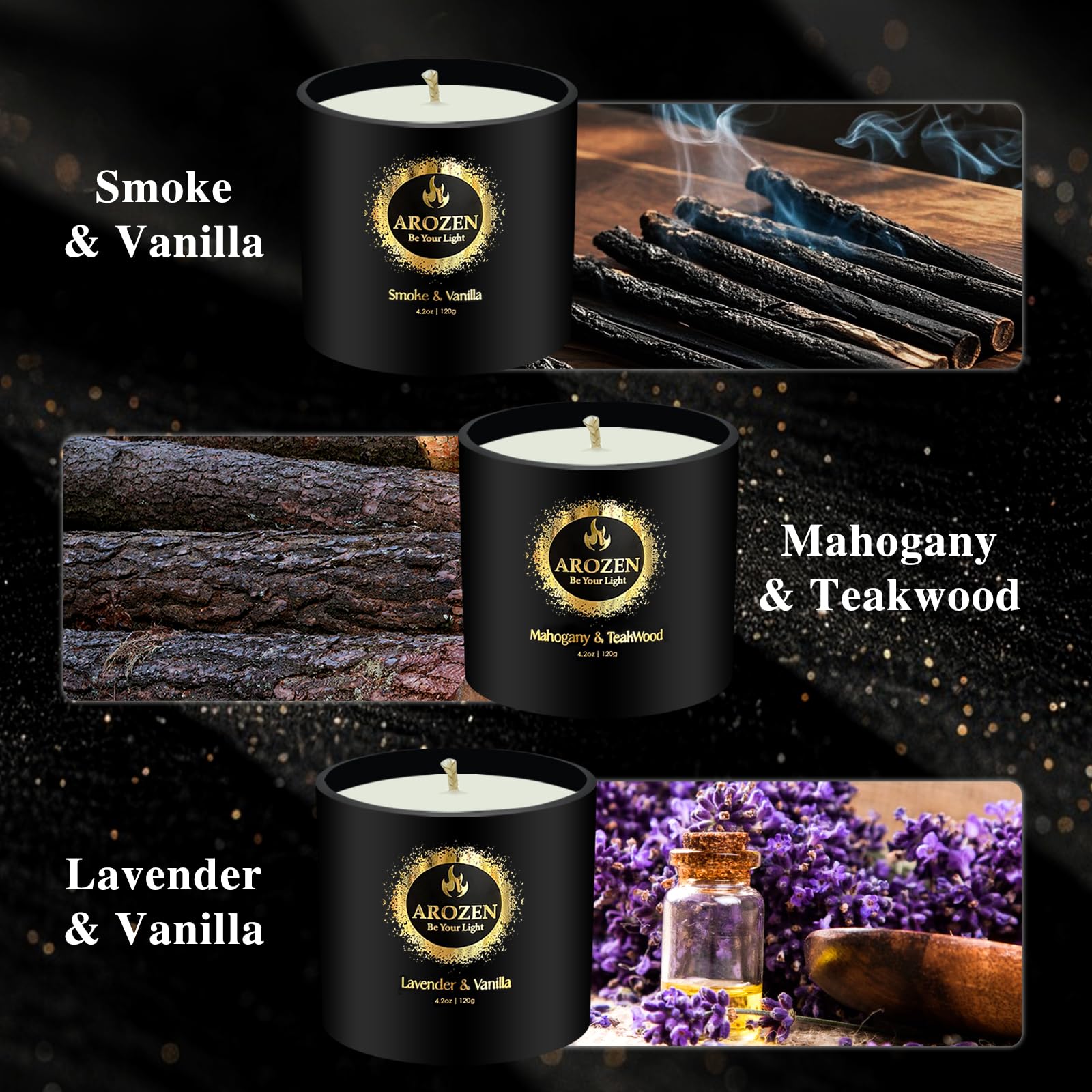 AROZEN 3 Pack Scented Candles Set | Men Candle Gift Set, Aromatherapy Scented Candles for Home, Gifts for Men Dad Fathers Day, Soy Candle of Lavender, Mahogany Teakwood & Smoke Vanilla,70H Burn Time