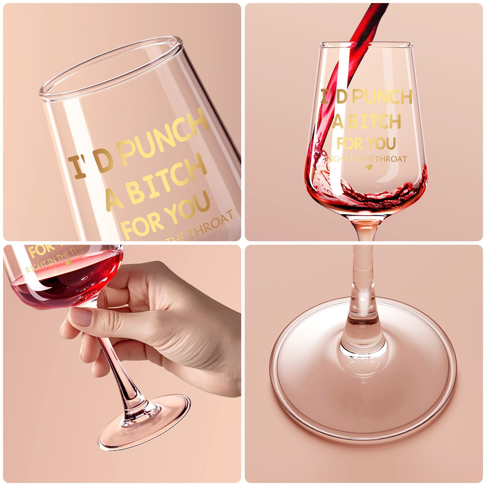 - BIRTHDAY GIFTS FOR WOMEN: Looking for a hilarious and unforgettable gift? This funny wine glass features the bold saying, “I'D PUNCH A BIT@H FOR YOU RIGHT IN THE THROAT”—sure to get laughs and start conversations. It’s a unique and fun gifts for your mom, wife, sister, daughter, best friend, girlfriend, BFF, aunt, or any special woman in your life. Perfect for birthdays, Mother’s Day, Christmas, Valentine’s Day, and more.