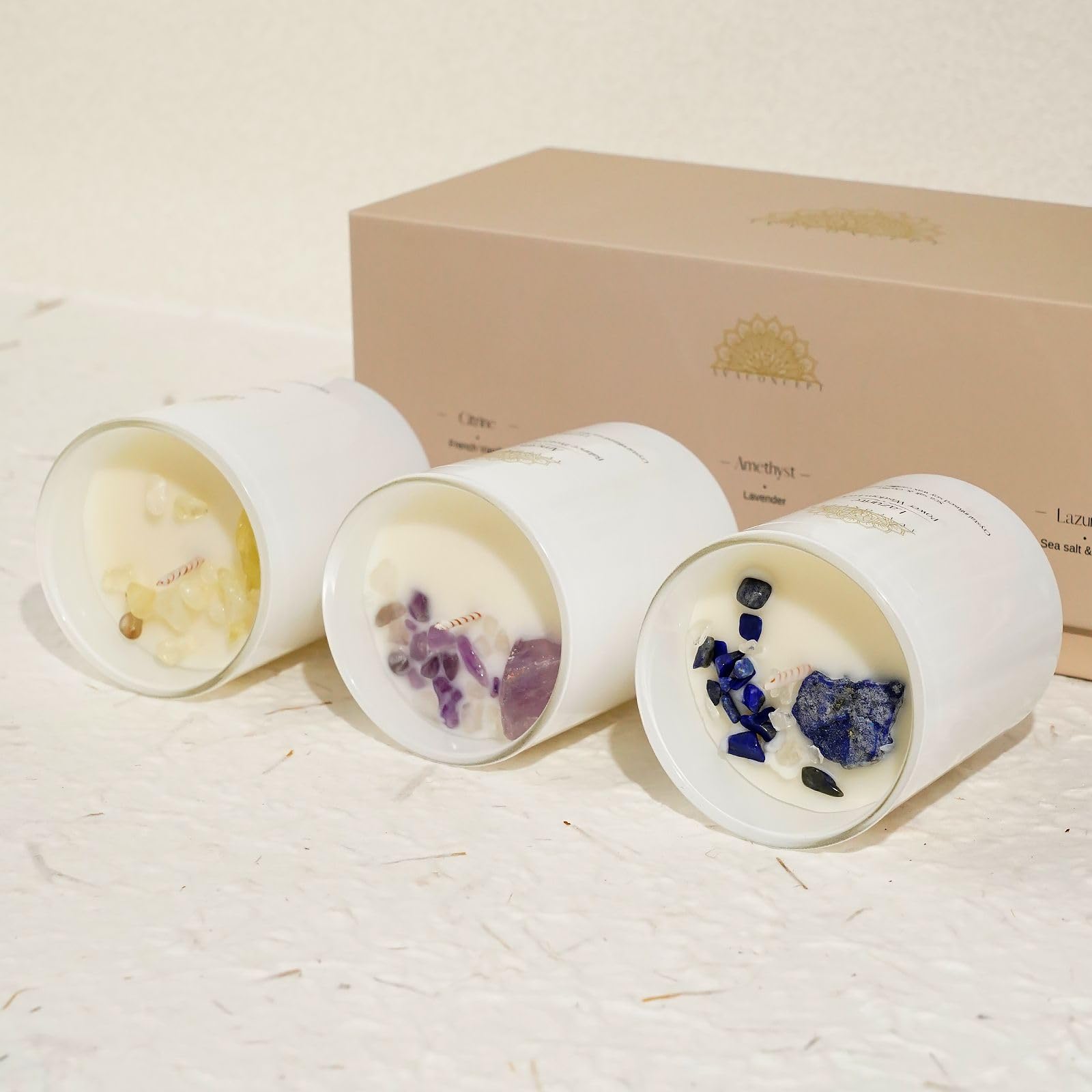 - ✅ Charming and Unique - Indulge yourself or someone special with these Amethyst, Lazurite, and Citrine crystal candles, designed to release positive energy and a delightful fragrance.