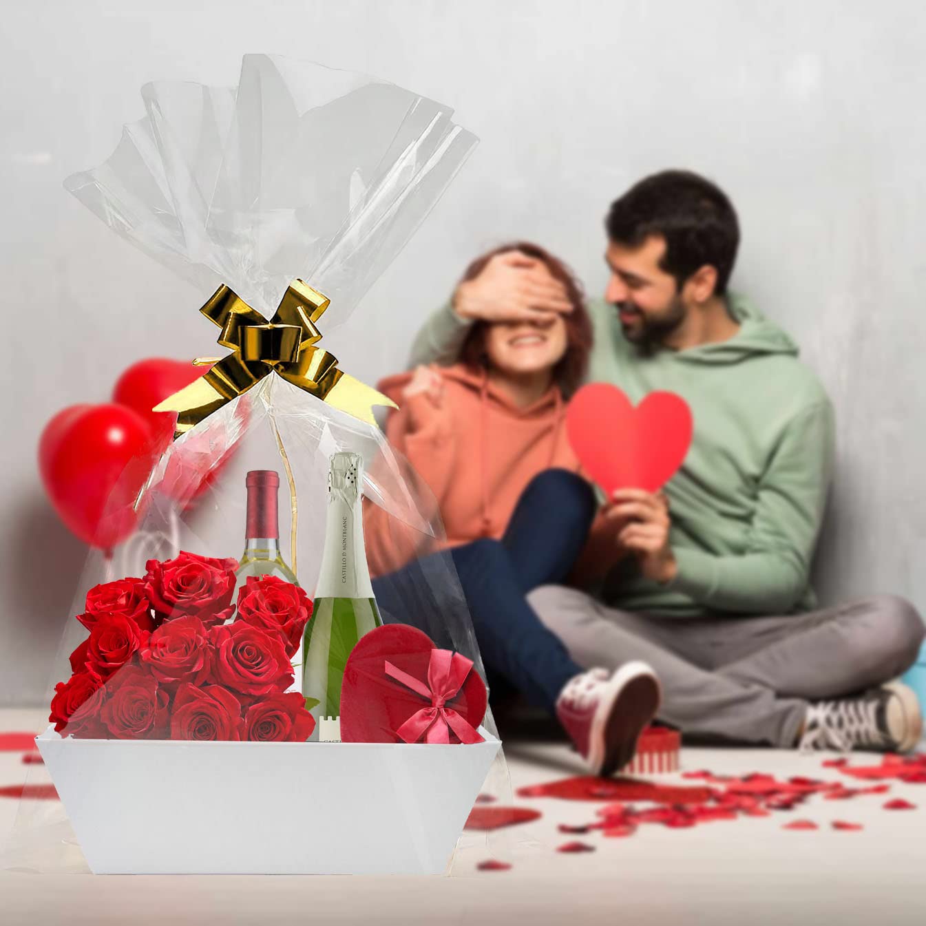 - EVERYTHING IN ONE PLACE: 5 PCS Market tray cardboard baskets, 5 PCS gold bows for any occasion and 5 PCS good quality plastic bags all included in this kit to make gift baskets as easy as possible.