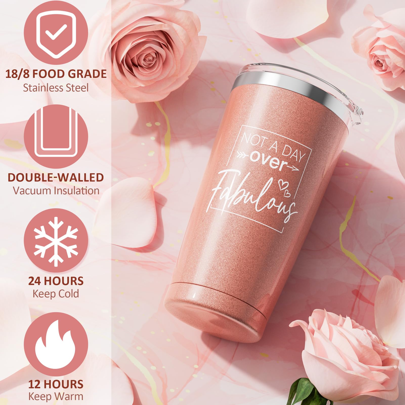 - INSULATED VACUUM TUMBLER: Made of 18/8 food-grade sturdy stainless steel, with double-walled vacuum insulation, this sweat-free insulated tumbler with lid can preserve beverage temperature up to 24h for cold & 12h for hot, great for iced coffee, tea, wine, juice, champagne, smoothies, sodas, milkshake, etc; 'Not A Day Over Fabulous', positive quote printing brings her smile & happy mood every day, express your love and care, making it an ideal birthday gifts for her relaxing gifts for women