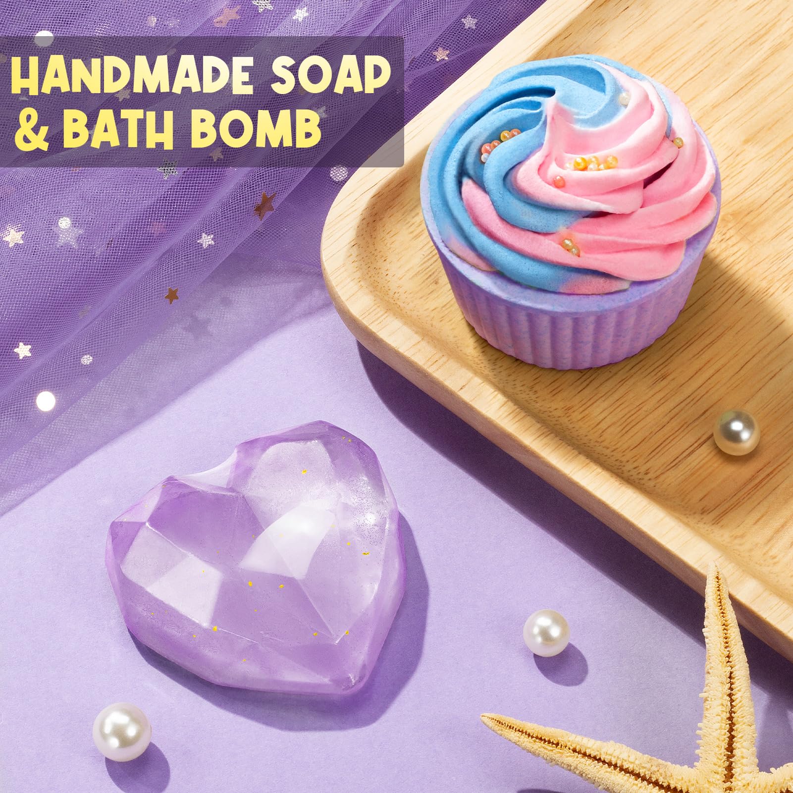 - LAVENDER-SCENTED RELAXING SPA GIFTS: The 3.5oz Lavender scented candle, made of plant essential oil & natural wax, can burn smokelessly & evenly for up to 20 hours. Comes with a diamond handmade heart-shaped soap, a cupcake bath bomb, all release gorgeous & long-lasting lavender fragrance, will bring her a luxurious & sublime bubble bath while enjoying her beverage, help soothe her mind and relax body. A thoughtful Lavender-scented relaxing spa gifts baskets for female!