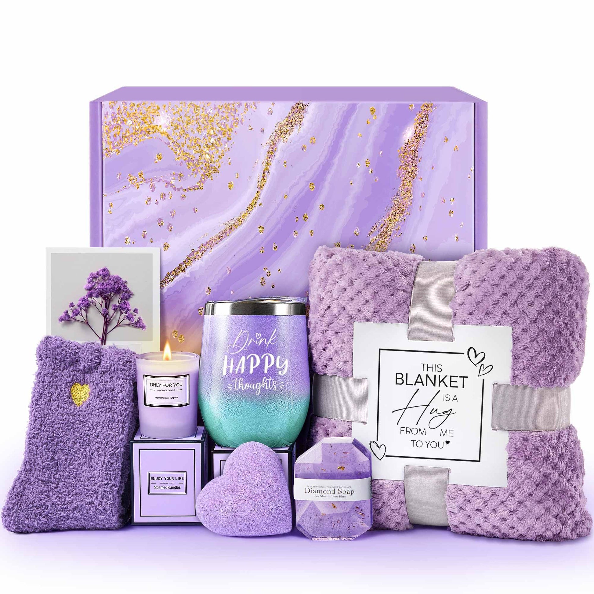 - ๐ธ Relaxing Spa Gift Basket for Women: The Lavender scented candle, made with pure plant essential oil and 100% natural soy wax, is non-toxic and burns smokelessly and evenly. The 'Drink Happy Thoughts' print on the wine tumbler shows your best wishes. Along with lavender-scented bath bombs, they provide a luxurious and relaxing bath experience that soothes the mind and relaxes the body