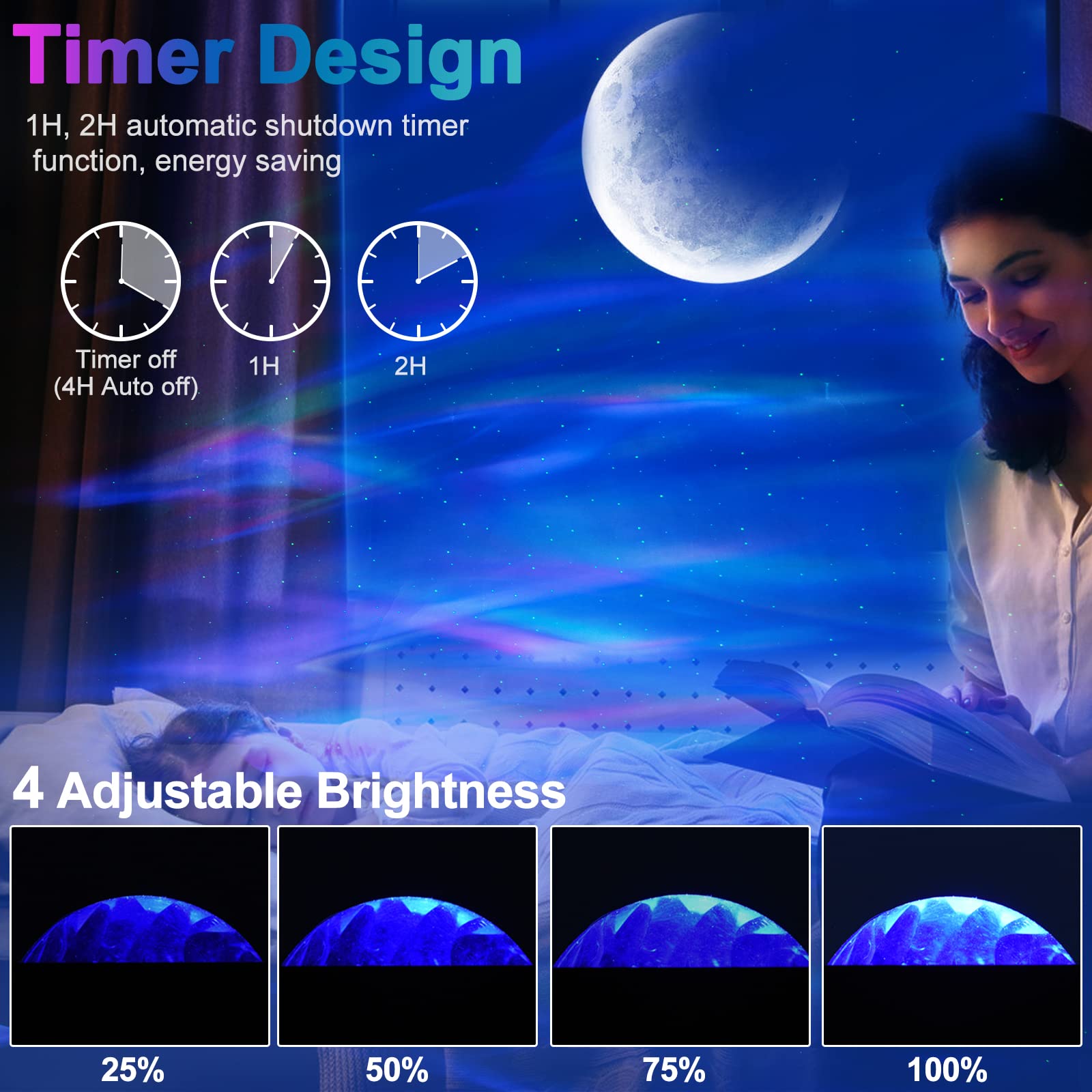 - 3 in 1 Night Projector: Cadrim aurora star light projector with moon helps add a nice atmosphere to your room, enjoy the aurora setting that projects an imitation of the northern lights, beautiful aurora lights, and color is impeccable, the stars are sharp in color, and the surface of moon is uneven.