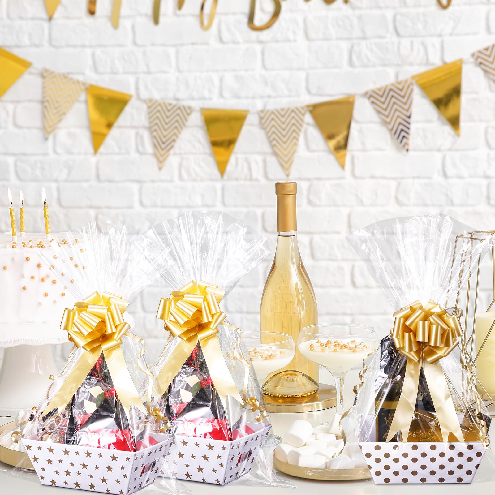 - Gift Basket Kit: includes 12 golden basket for gifts empty, 20 clear gift bags, and 18 gold pull bows; This thoughtful combination simplifies the process of packaging and decorating your Christmas gifts, catering to your needs for convenience and practicality