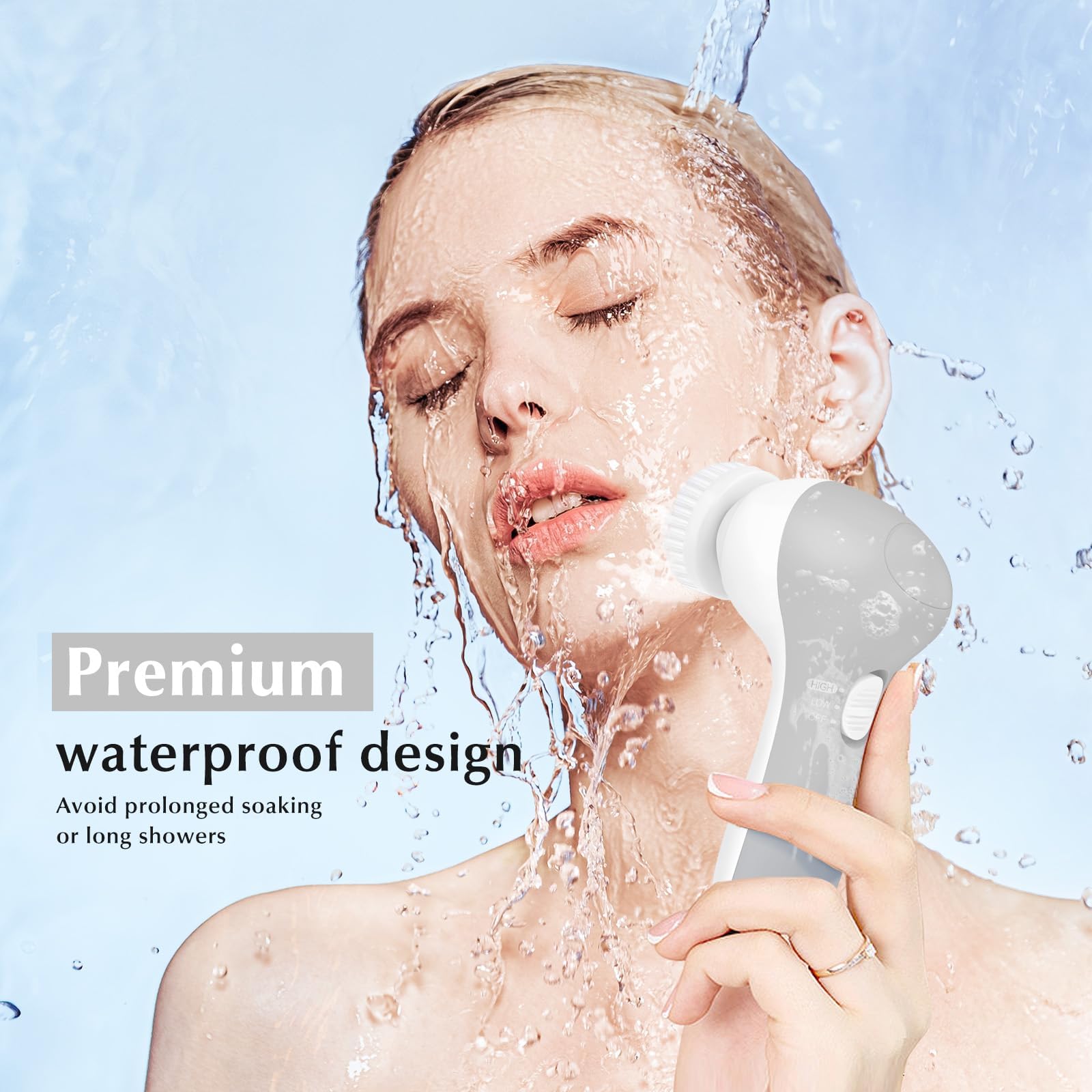 - PREMIUM WATERPROOF AND SAFE DURING SHOWER: This facial exfoliating brush is IPX7 waterproof, making it safe to use in the shower. For the facial cleansing brush to last, we sincerely recommend that you keep the battery compartment dry and do not submerge the entire portable facial brush in water ; Does not include 2 AA batteries
