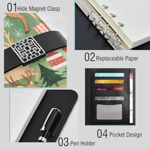 DIGTIA Christmas Deer Trees Gifts Snowflakes PU Leather Notebook A5 Binder 6 Ring Refillable Journal with Magnetic Buckle Closure Loose Leaf Travel Office Planner Budget Binder Notepad Portfolio,