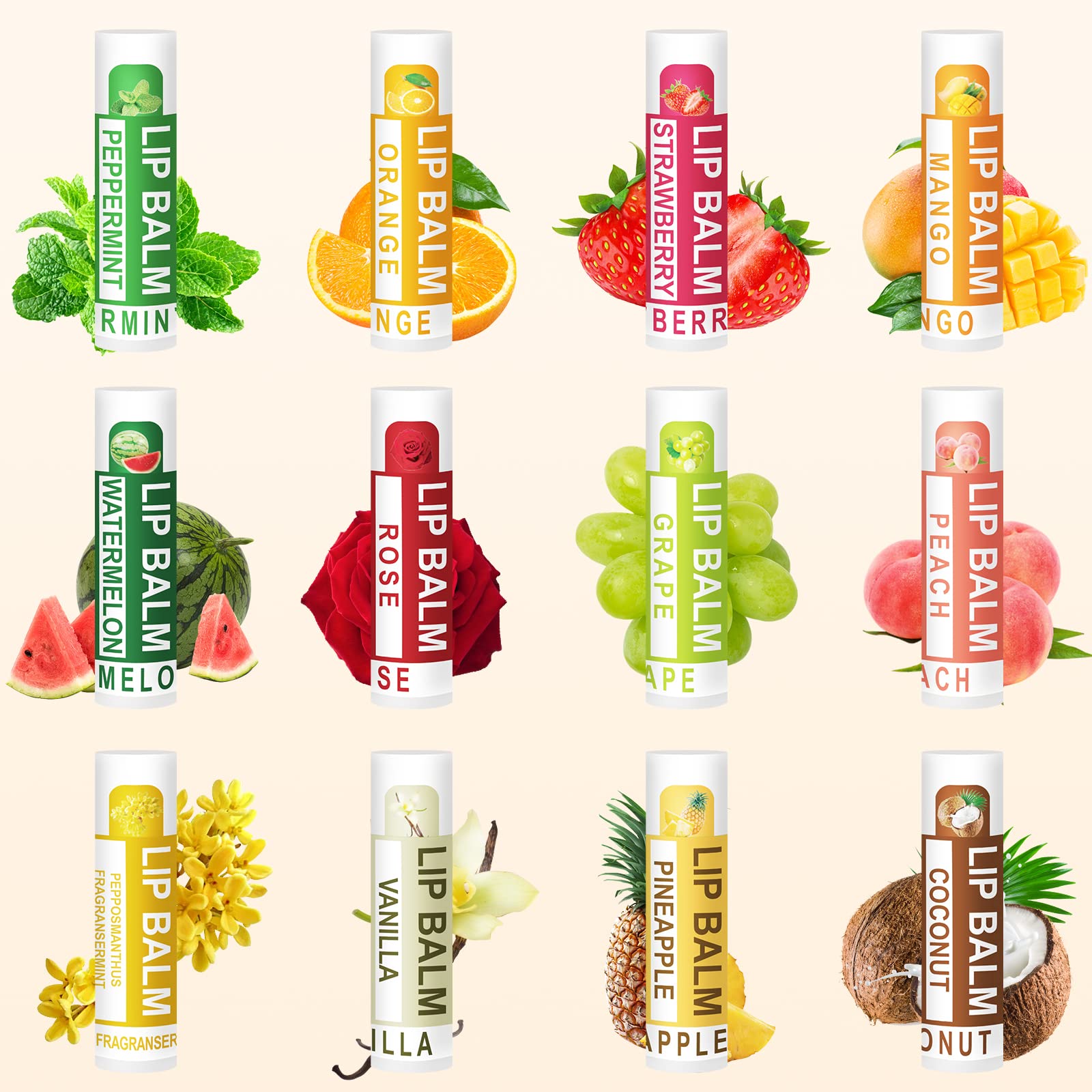 • Flavored Lip Balm: Lip balm set of 60 tubes, featuring 12 delightful flavors (Strawberry, Watermelon, Mango, Coconut, Mint, Pineapple, Rose, Osmanthus, Grape, Peach, Orange, Vanilla), this collection is the PERFECT gift for anyone