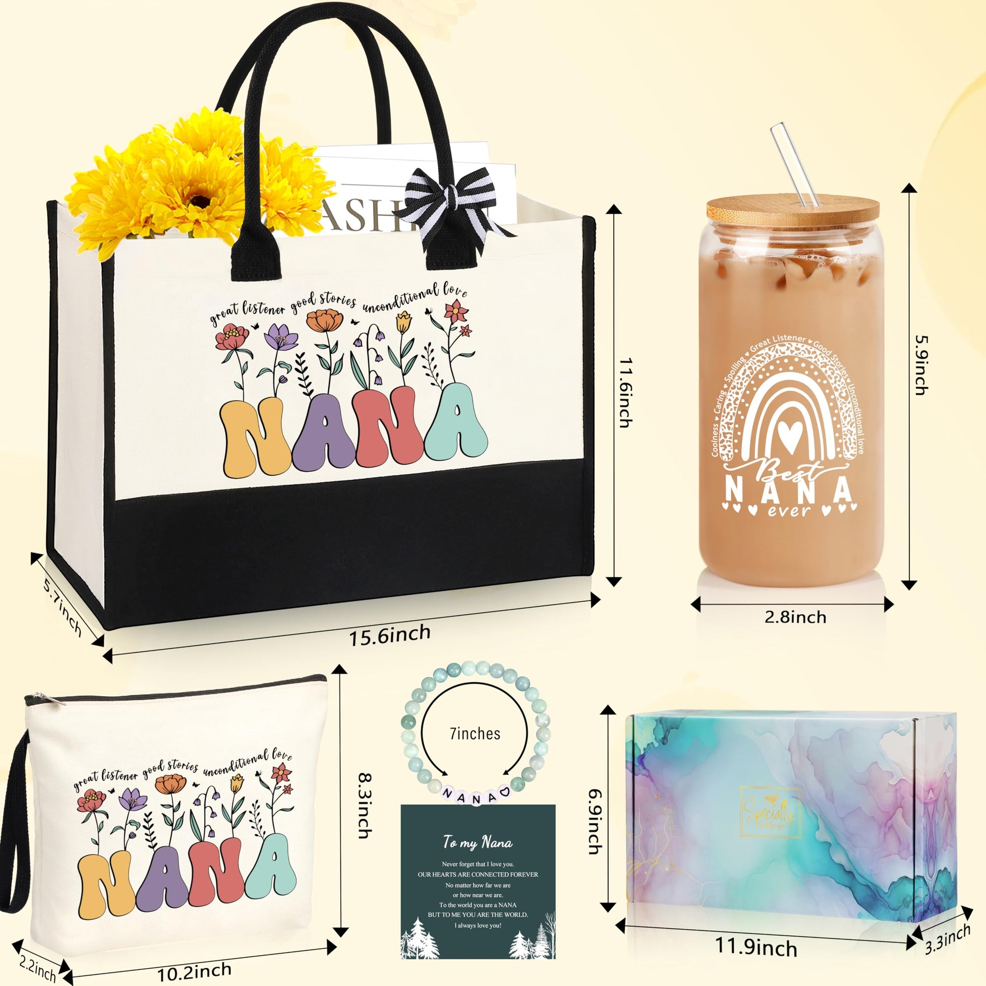 - Gifts Set for Nana: Nana Gifts contain all the well-designed items including Nana Tote bag, Nana makeup bag, natural stone bracelets and Nana cards, 16OZ glass coffee cups and an elegant gift box that is great value for money. There's never a better time to return nana's love for us with a thoughtful gift. These gifts are sure to bring a smile to her face and let her know how much you care