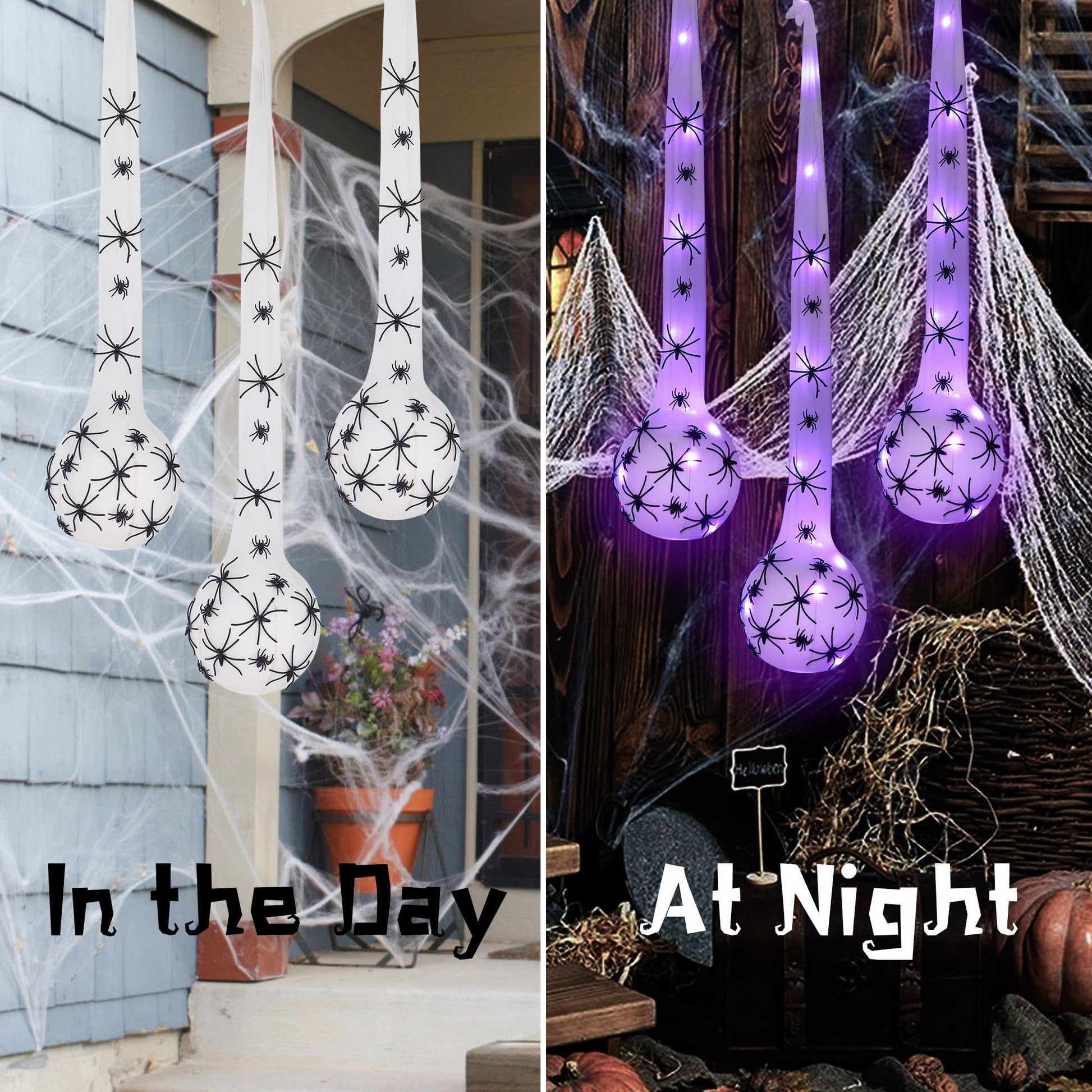 DR.DUDU 3 Pack Hanging Halloween Decorations Outdoor Giant Spider Egg 5"x28", Light Up Spider Webs with Purple LED Lights, Waterproof for Halloween Props Party Gifts, Yard Garden Tree House Décor
