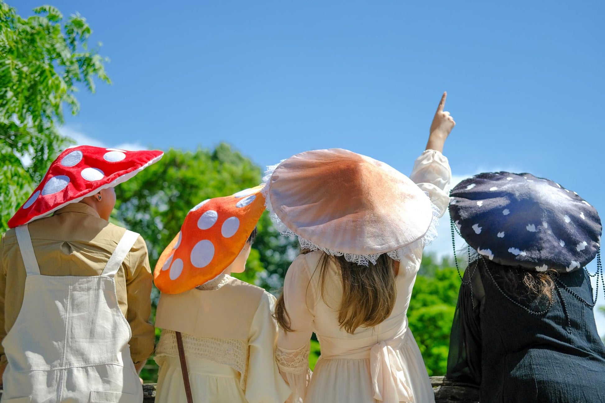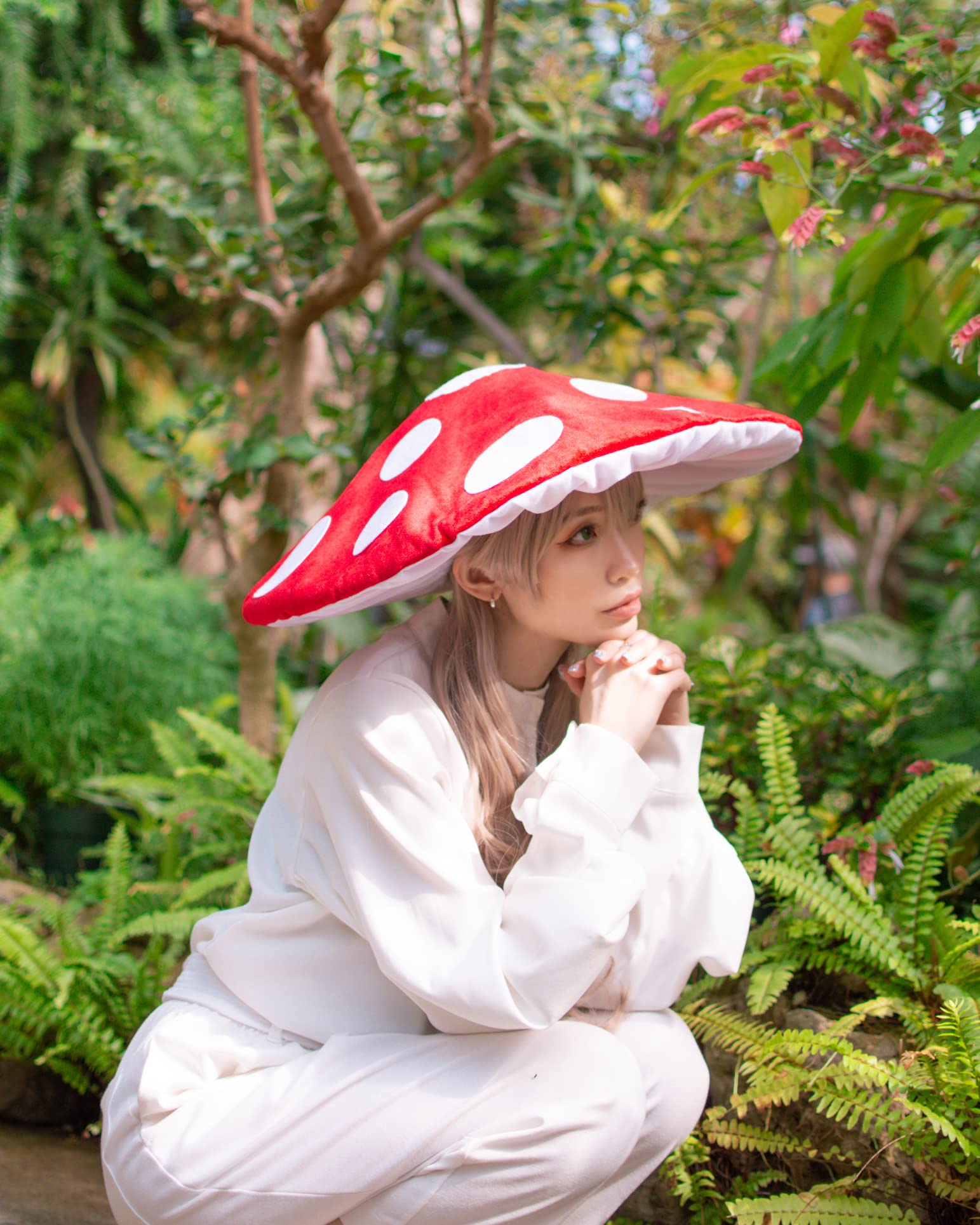 • [DESIGN] This wide brim mushroom shaped hat measuring 20 inches across is sure to give that oversize look. The gathered inner white layer imitates the 'gills' of the mushroom cap. Fits any head size with stretchy elastic.