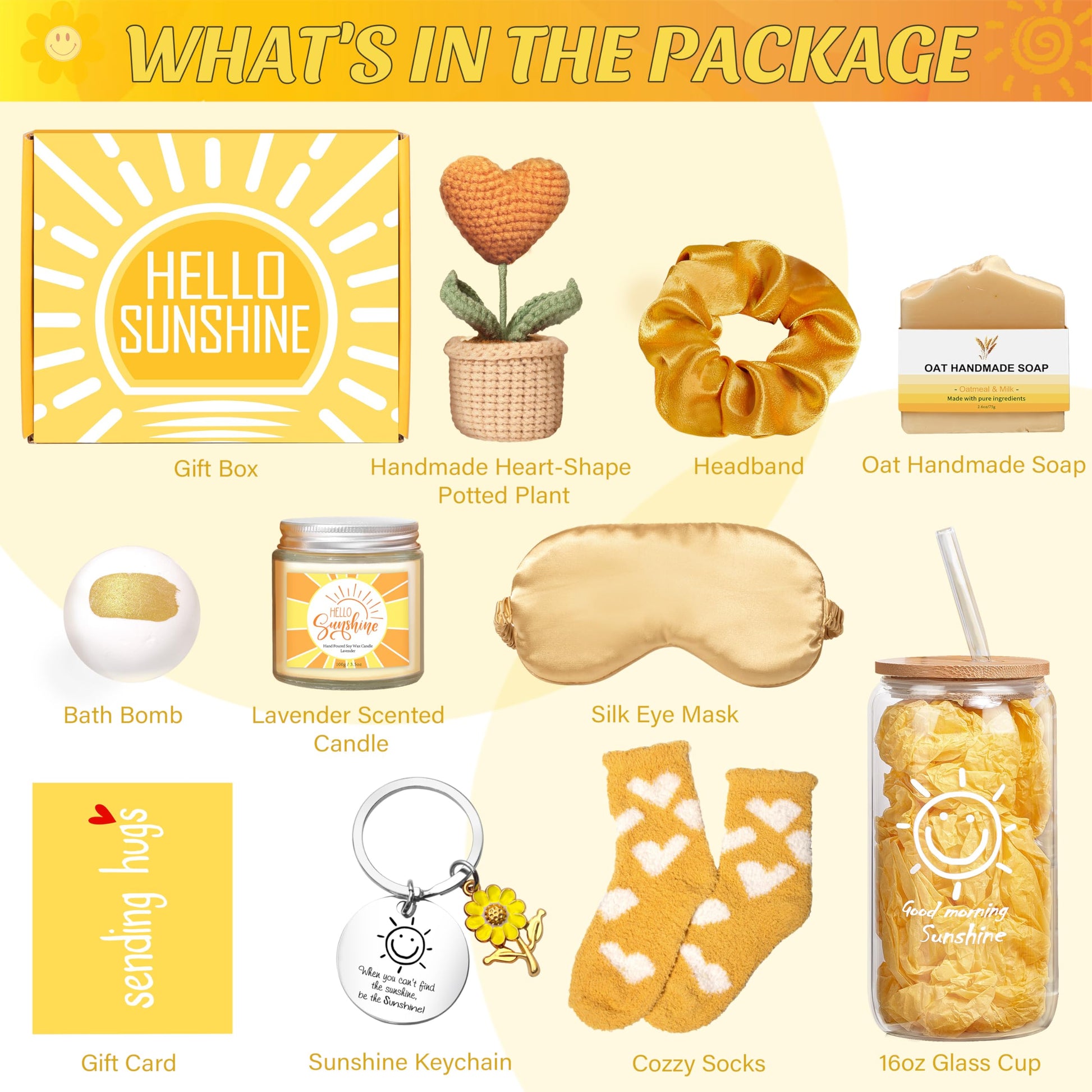 - Thoughtful Gift Set: This unique collection of 11 pampering gifts is the perfect way to show appreciation for the special women in your life.This is a gift Sets for women that symbolizes positivity, health and happiness. Bring smiles and cheers to her day with this sending sunshine women gifts!