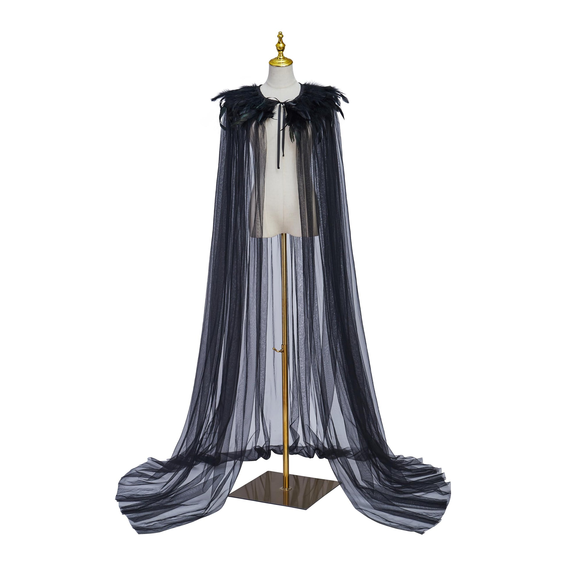 • Design: Black organza topped with Black feather. Buckle design, easy to put on and take off, also prevent the cape falling from your body. The vampire cape is wrapped in a soft and lightweight mesh gauze, suitable for four seasons.