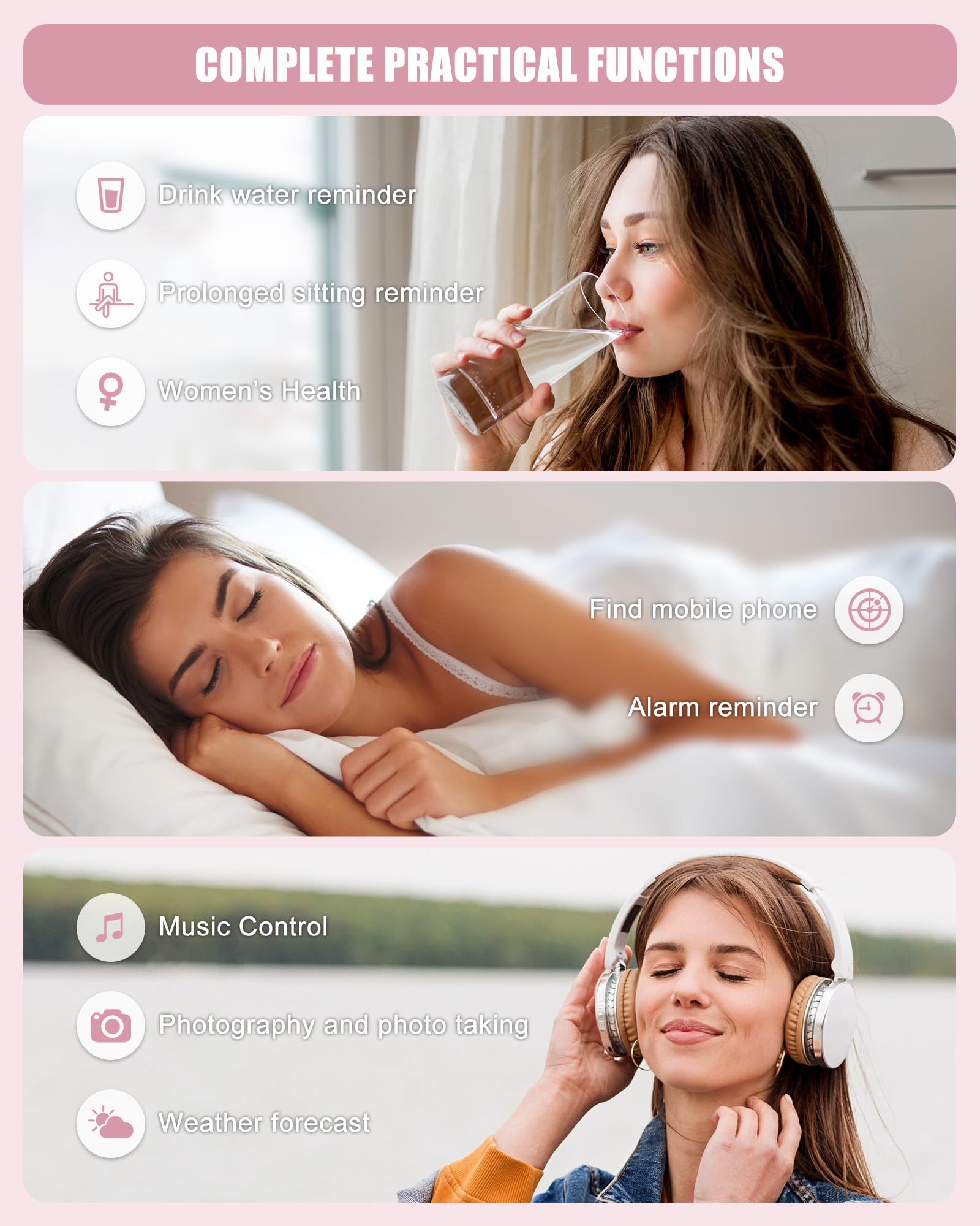 • 【Health & Lifestyle Management】Stay on top of your health with 24/7 real-time tracking of heart rate, blood oxygen, and sleep patterns. Get in-depth sleep analysis and personalized reports to improve your sleep quality. Additional smart features include weather updates, hydration and sedentary reminders, and female health tracking, helping you maintain a balanced and healthier lifestyle.