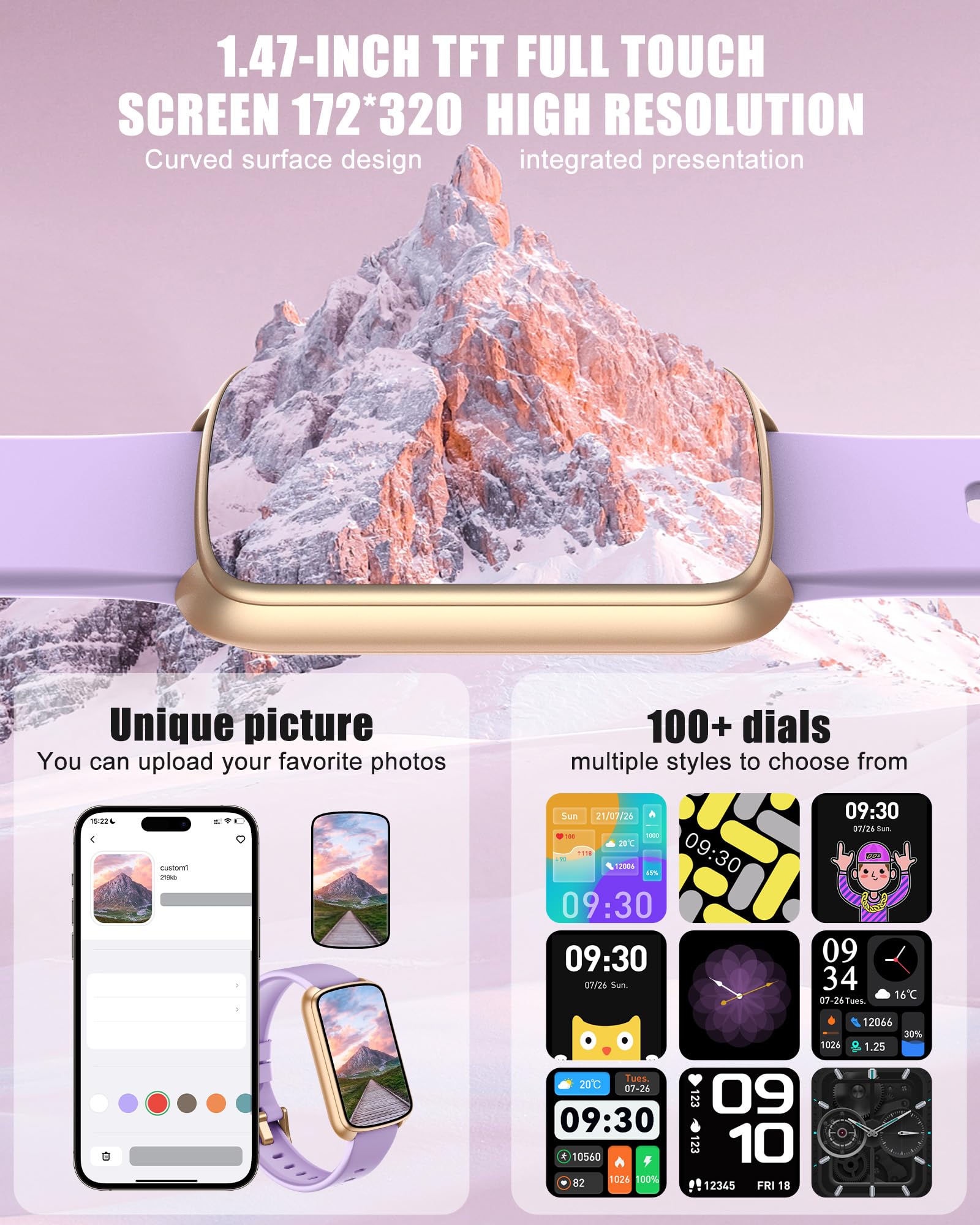 • 【1.47' Touchscreen & 200+ Dials】Enjoy a crystal-clear 1.47-inch TFT display with brilliant clarity and responsive touch control. The GloryFit app offers over 200 stylish watch faces, plus the option to upload your own photo for a personalized look. This feature-rich display seamlessly combines advanced functionality with custom style, elevating your smart watch experience.