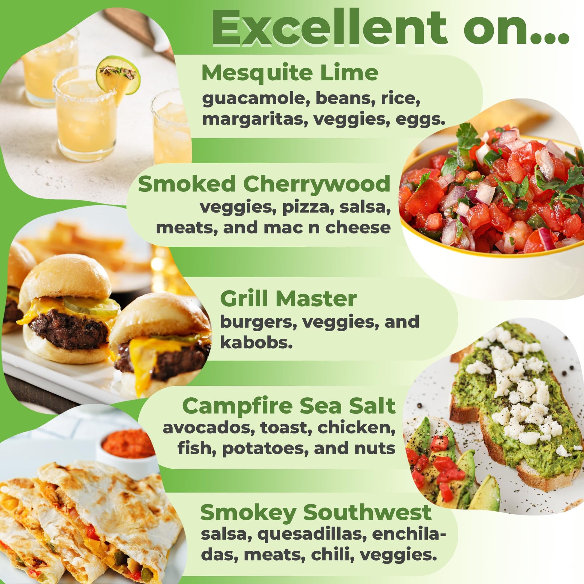 - SMOKED CHERRYWOOD : Infuse dynamic smokey cherrywood flavors into meals. Ideal for popcorn, veggies, pizza, salsa, meats, and mac and cheese. Elevate drinks and desserts - Bloody Mary, Margaritas, Chocolate, Ice Cream, and more. Taste the difference.