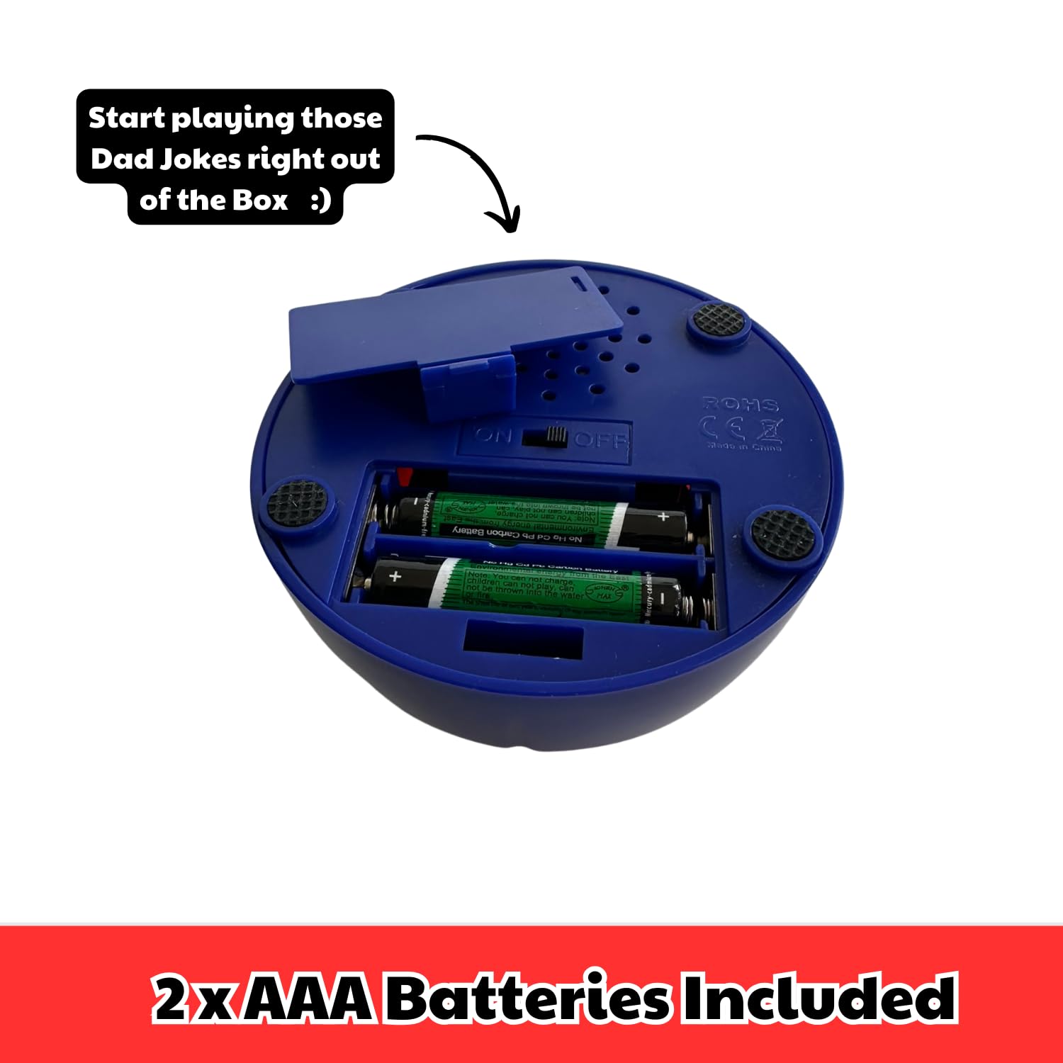 • EXTRA 'FUNNY' DAD JOKES - Good old fashioned, family friendly and extra cheesy dad jokes. Hours of family fun and entertainment. The Dad Joke 3000 button features 75+ cheesy dad jokes and has 2 x AAA Batteries - so those Dad Jokes are ready to launch right out of the box.