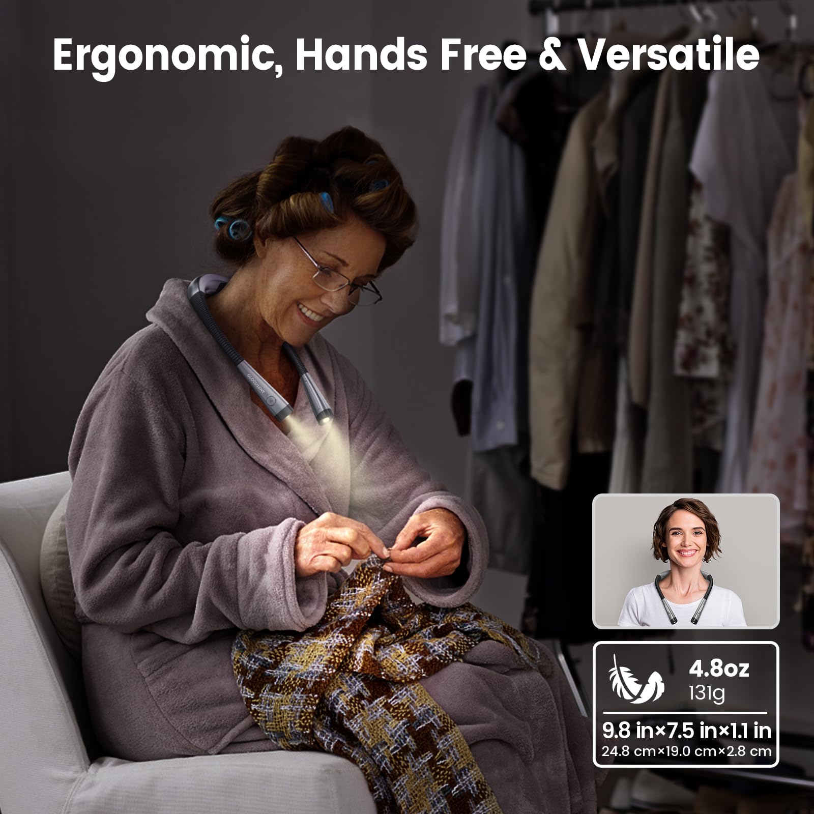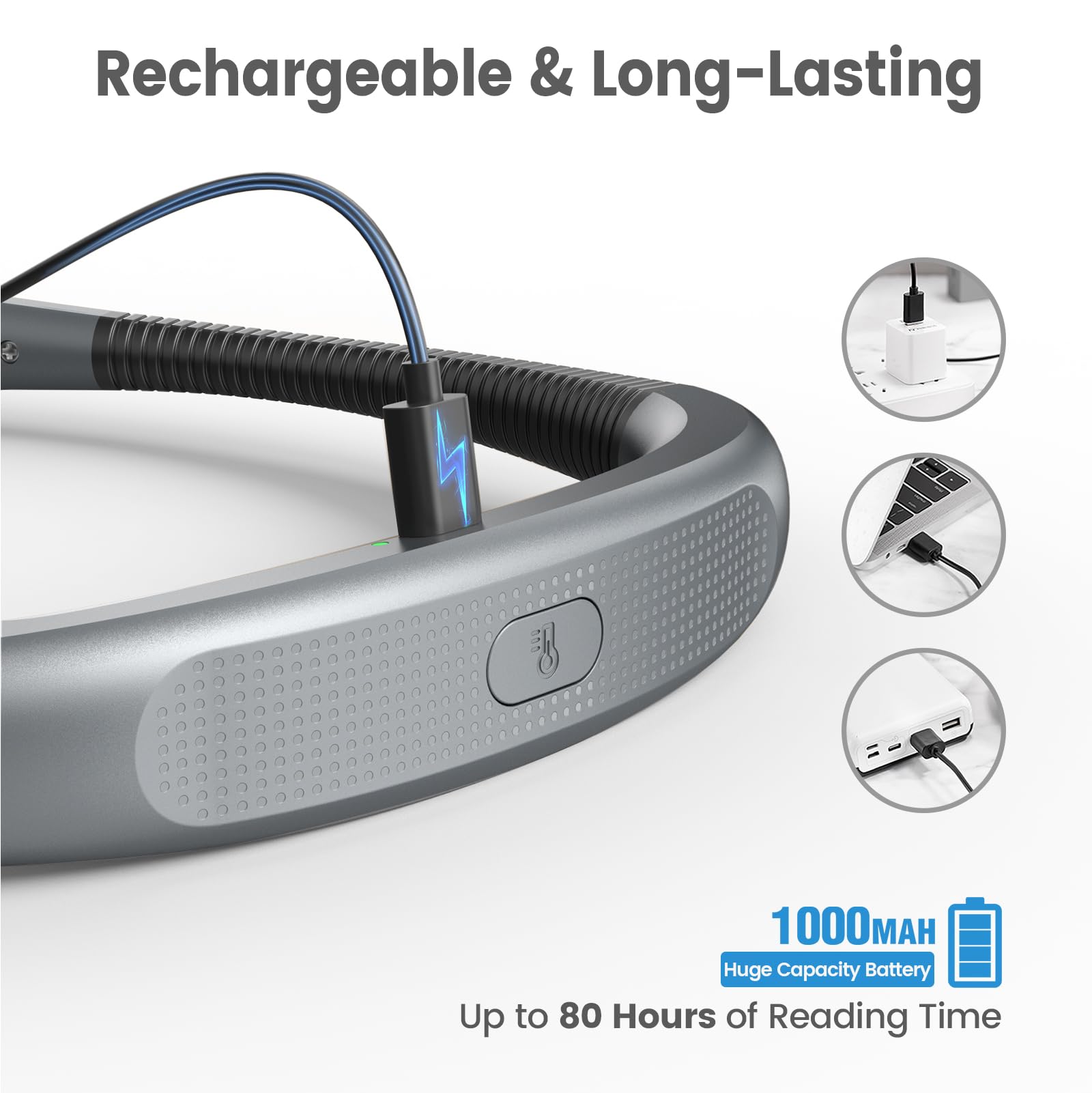 • [Rechargeable & Long-Lasting] This neck reading light rechargeable with USB Type-C which is reversible and therefore easier to plug in compared with other neck lights for crafts charged with Micro-USB. Up to 80 hours (general reading, single head) of powerful, non-diminishing brightness from the included premium rechargeable 1000mAh battery. A long lasting usb rechargeable book light for reading in bed.