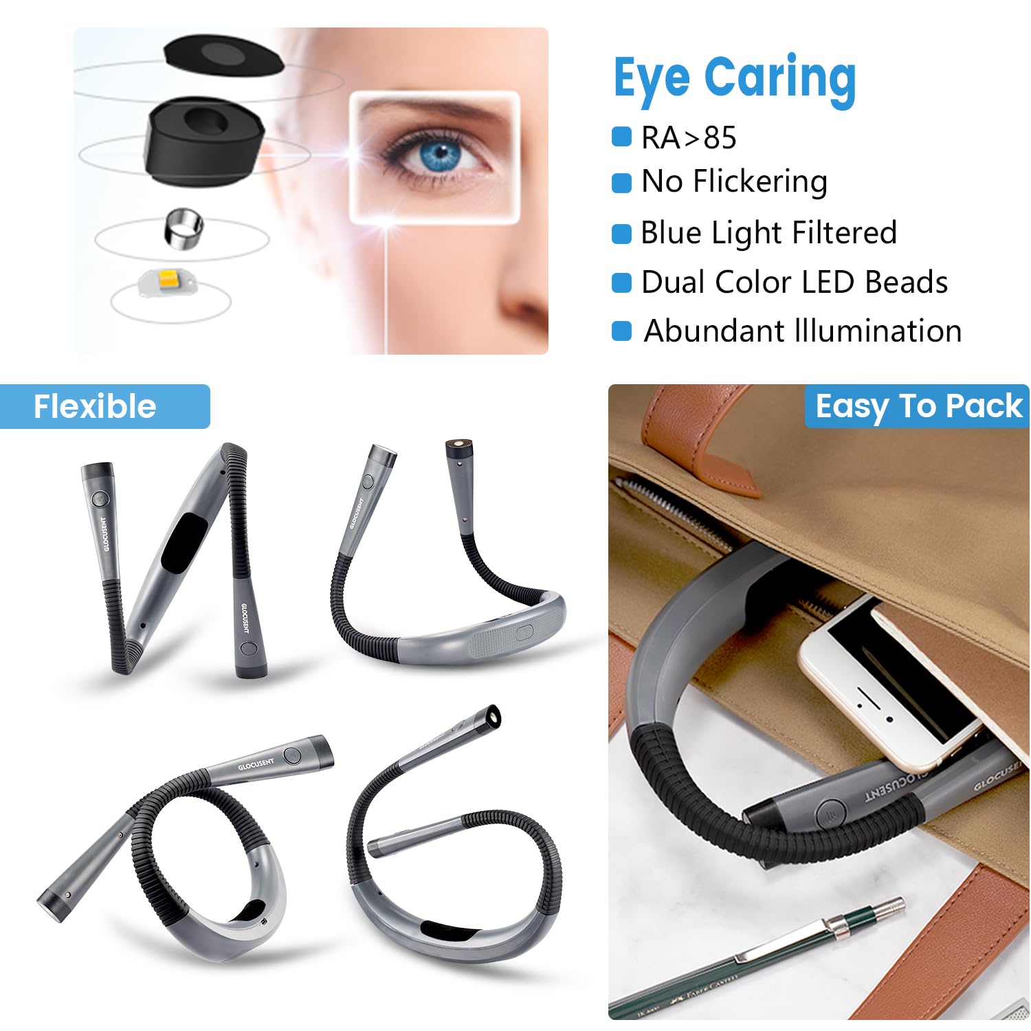 • [3 Color & 6 Brightness Adjustable] This Glocusent reading light owns 3 useful color temperature modes: yellow(3000K), warm white(4000K) and cool white(6000K). Each neck light head owns an independent switch for 3 brightness levels dimmable. The perfect neck light for crocheting and reading light for bed, knitting, camping, or repairing etc.