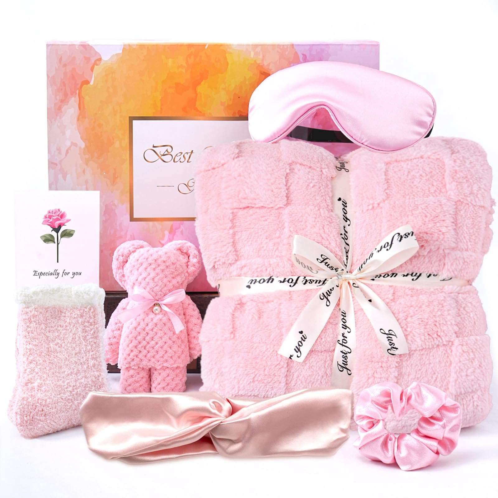 • 8PCS Luxury Gift Set for Every Celebration:Discover the perfect birthday gift box or gift baskets for women with this curated collection! Unbox joy with a plush flannel blanket, adorable bear-shaped towel, fuzzy socks, silk eye mask & headband, hair elastics, a greeting card, and an elegant gift box. Ideal for showing appreciation as teacher appreciation gifts, or for sending comfort with get well soon gift baskets for women and get better soon care package for women, all items combine comfort, style, and convenience in one package.