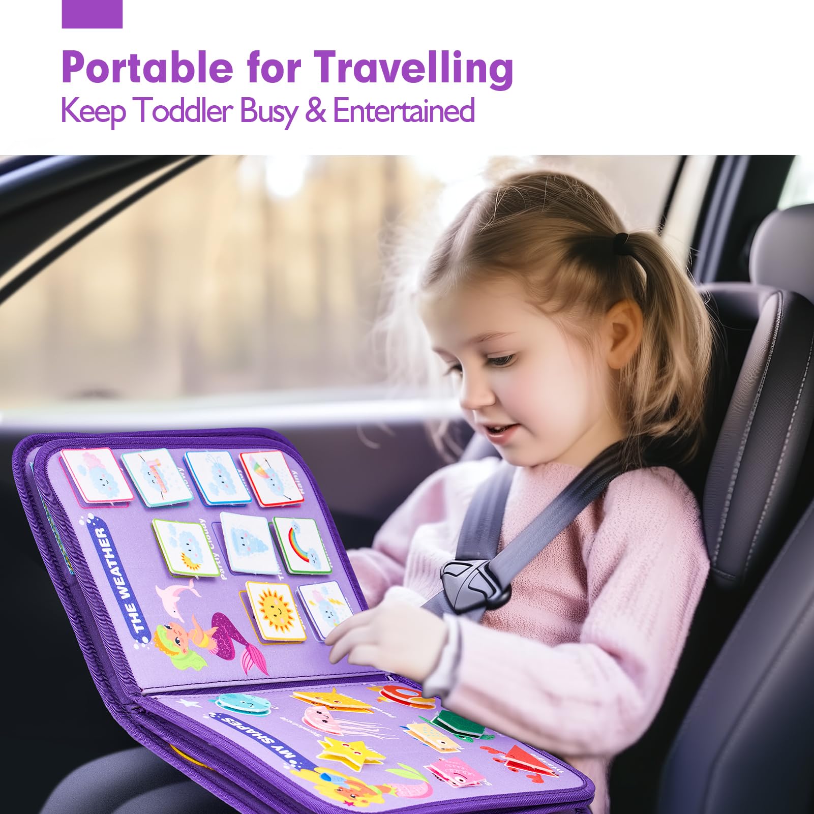 - Portable Travel Toys: The 11×9 inches size perfectly fits most diaper bags. Furthermore, there's a removable zipper design on cognitive boards, and it has a sturdy handle for easy carrying. It will be an excellent choice for travel activities and toddler toys. If you are looking for a busy book for toddlers 1-3, ours is definitely the perfect gift ideal that's not messy, noisy or screen time.