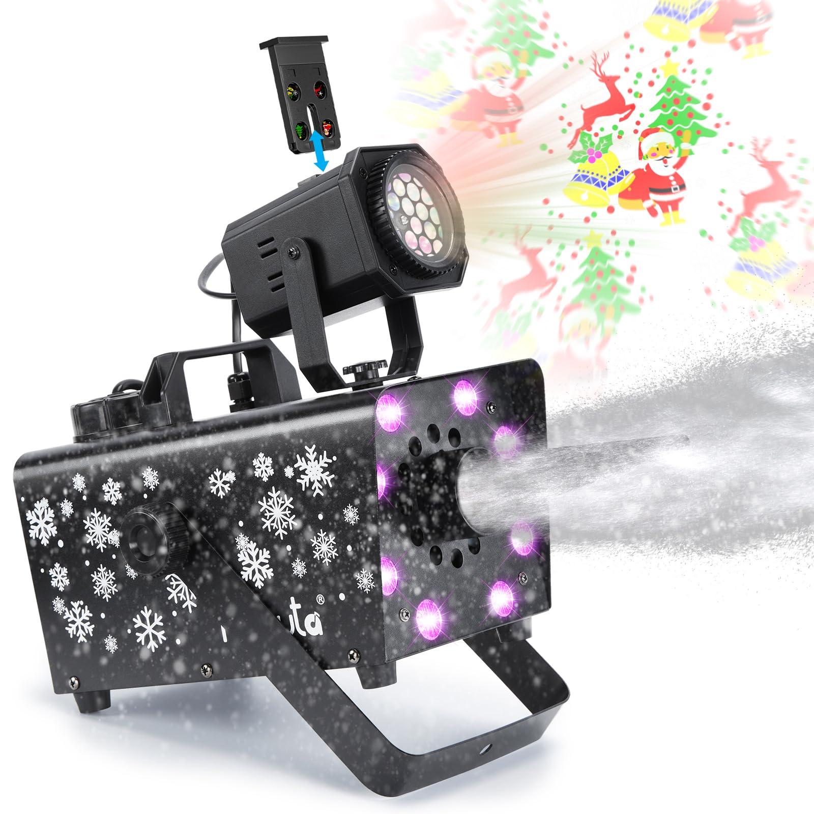 - LED PROJECTOR LIGHT: We’ve combined the snow machine with an LED projector light to provide convenience for you. There are 6 graphics options to meet different daily needs. These slides include Snowman Gift, Christmas Elk, Snowflake, Starry Sky, Halloween, Christmas and Snowman. Experience the magic of a wintry ambiance with our upgraded 800W snow machine. Whether for Christmas, parties, or festivals, this machine is your go-to solution for an immersive snowfall experience.