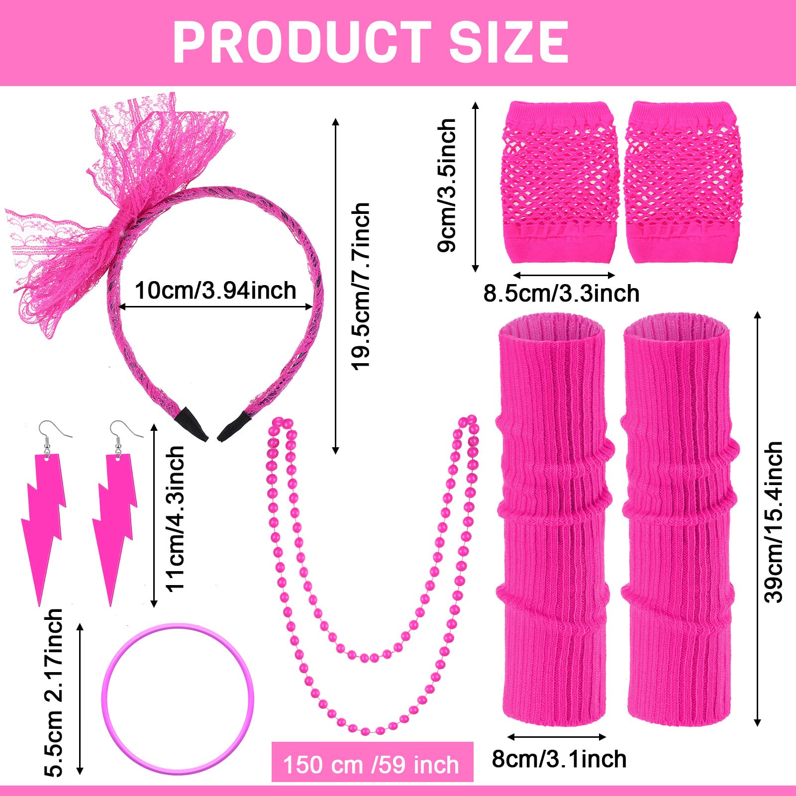 - Women 80s Accessories: this 80s accessories set consists of 1 piece of holographic 80s fanny pack, 1 pair of neon leg warmers, 1 pair of fishnet gloves, 1 pair of earrings, 1 piece of lace headband, 1 piece of necklace and 10 pieces of silicone bracelets, meeting your outfit dress up needs for 80s theme party