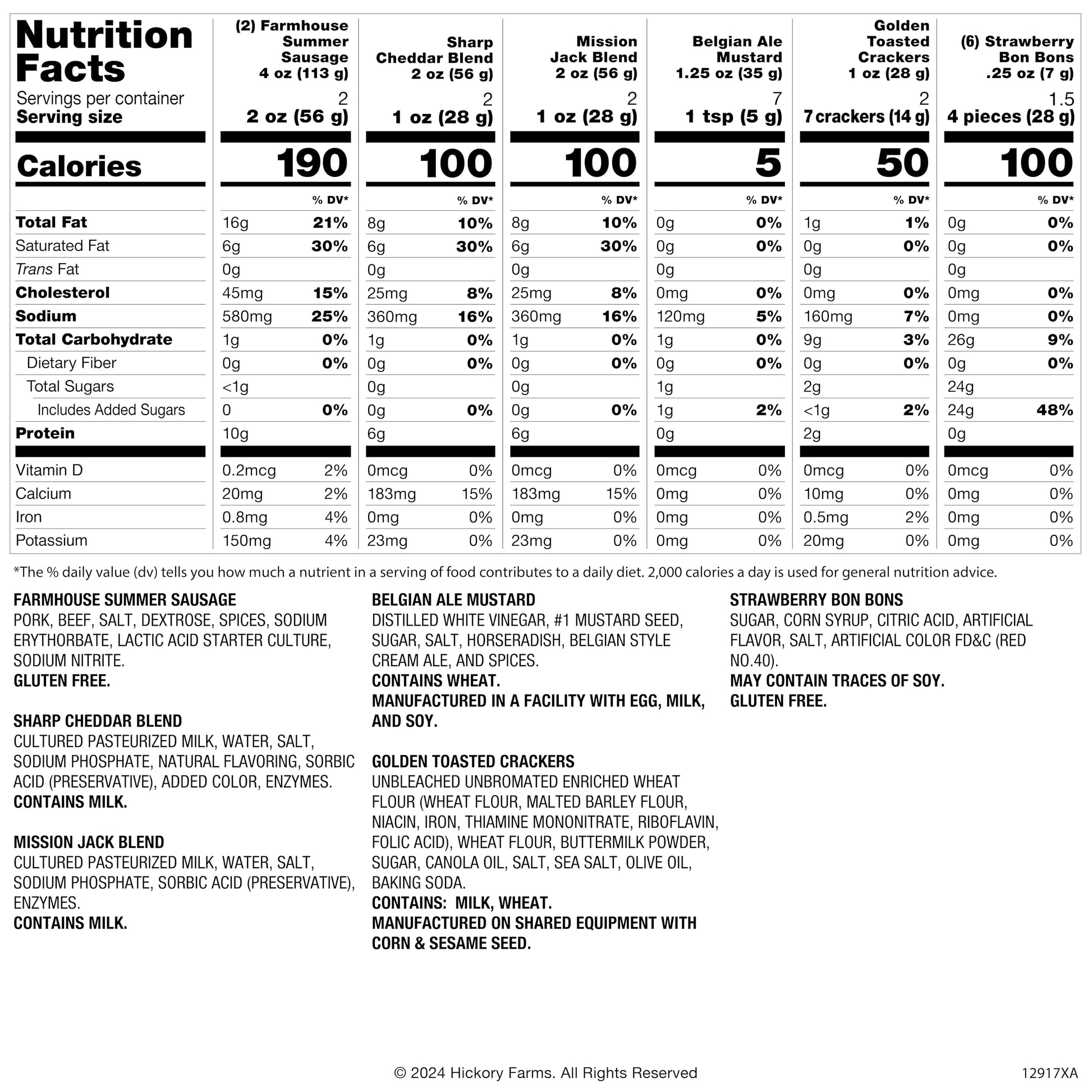 - Meat & Cheese: (2) 4 oz Farmhouse Summer Sausage, (2) oz Sharp Cheddar Blend, (2) oz Mission Jack Blend