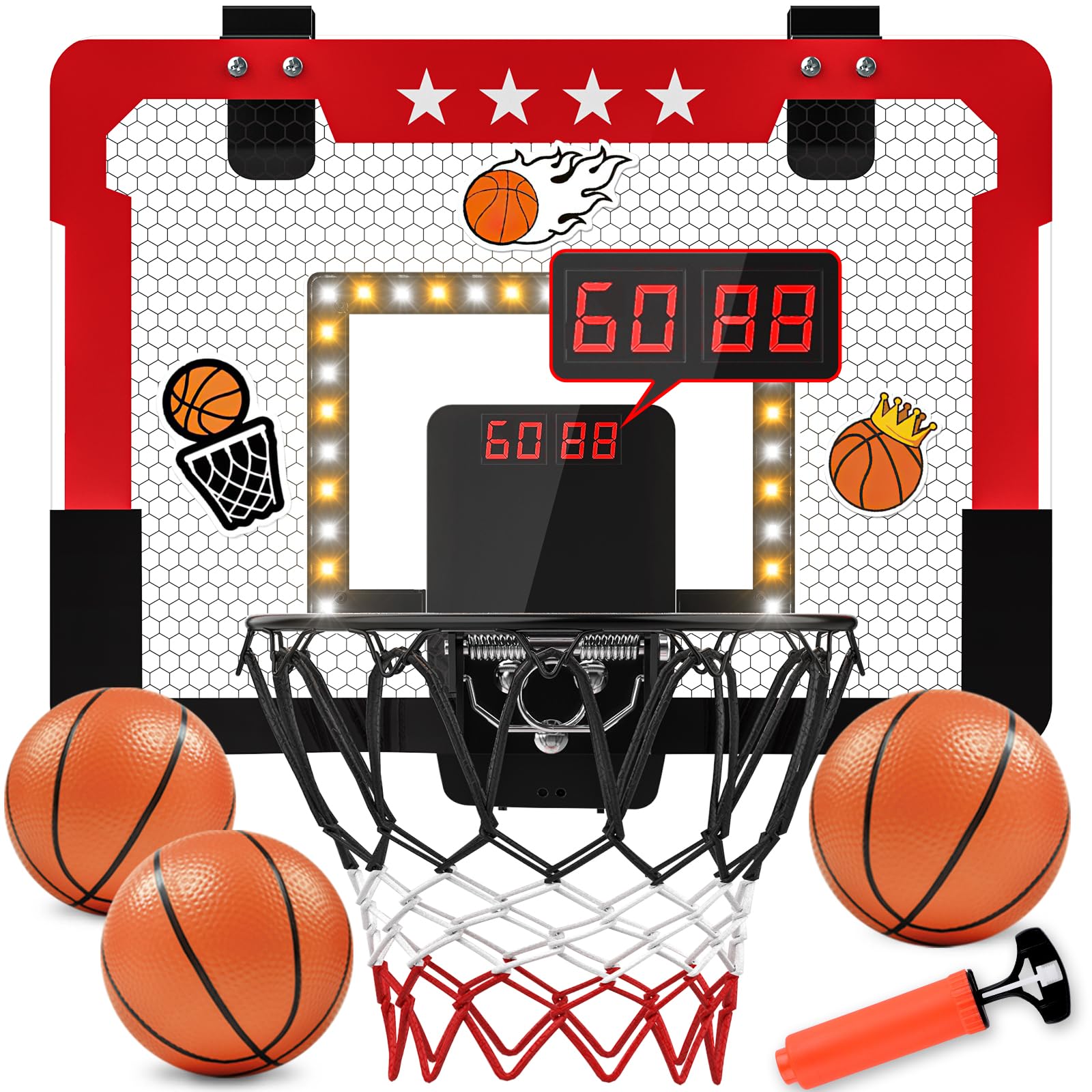 - High Quality and Durable: Our indoor basketball hoop is built to last, with a sturdy steel rim, shatterproof backboard, and a durable ball net ensuring long-lasting durability. The thick shock-proof sponge strips on the backboard not only protect your door from scratches but also effectively reduce noise. Additionally, this set includes 3 rubber basketballs, storage bag, 50 DIY stickers, reset remote, making it perfect for indoor and outdoor play.