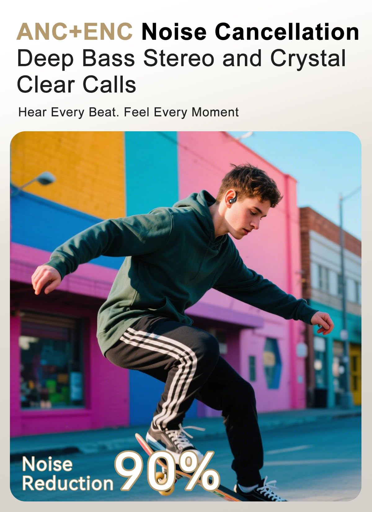- Pro-Grade Dual-Mode Noise Cancellation: Our noise cancelling earbuds Adaptive ANC proactively silences up to 90% of ambient noise for undisturbed music. During calls, ENC technology instantly kicks in, isolating your voice and cutting background noise by 75% so that you can make a clear call.