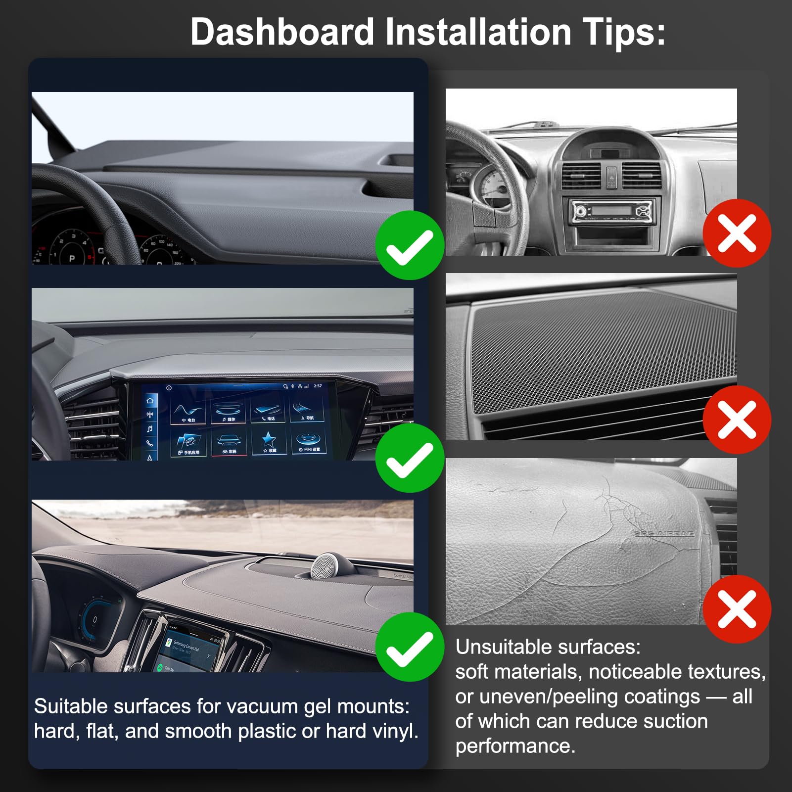 • Vacuum Lock + Gel Base — For Smooth, Flat Surfaces: Features a rotary vacuum-lock and 4-layer washable gel base that forms a rock-solid hold on flat, non-textured surfaces such as glass, glossy dashboards, or hard leather. Avoid use on curved, soft, or textured materials. To install, firmly press the gel base and rotate the vacuum lock clockwise until tight