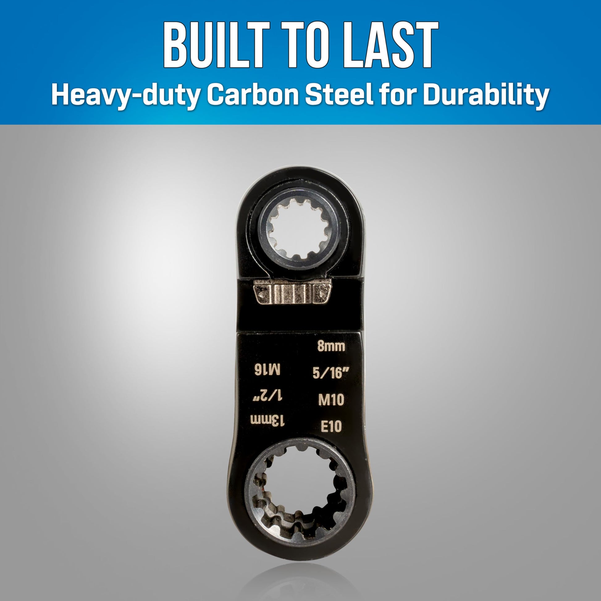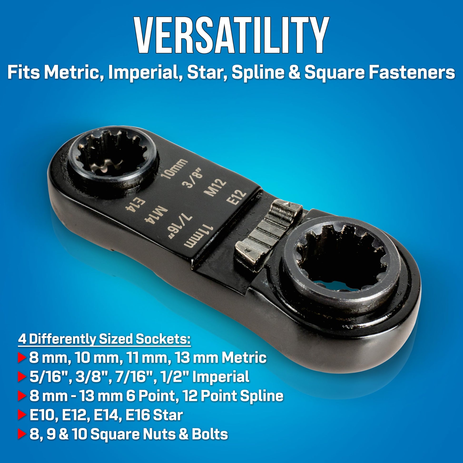 • VERSATILE SOCKET SET: Includes 4 different sockets for 8 mm, 10 mm, 11 mm, and 13 mm metric sizes, as well as 5/16', 3/8', 7/16', and 1/2' Imperial sizes.