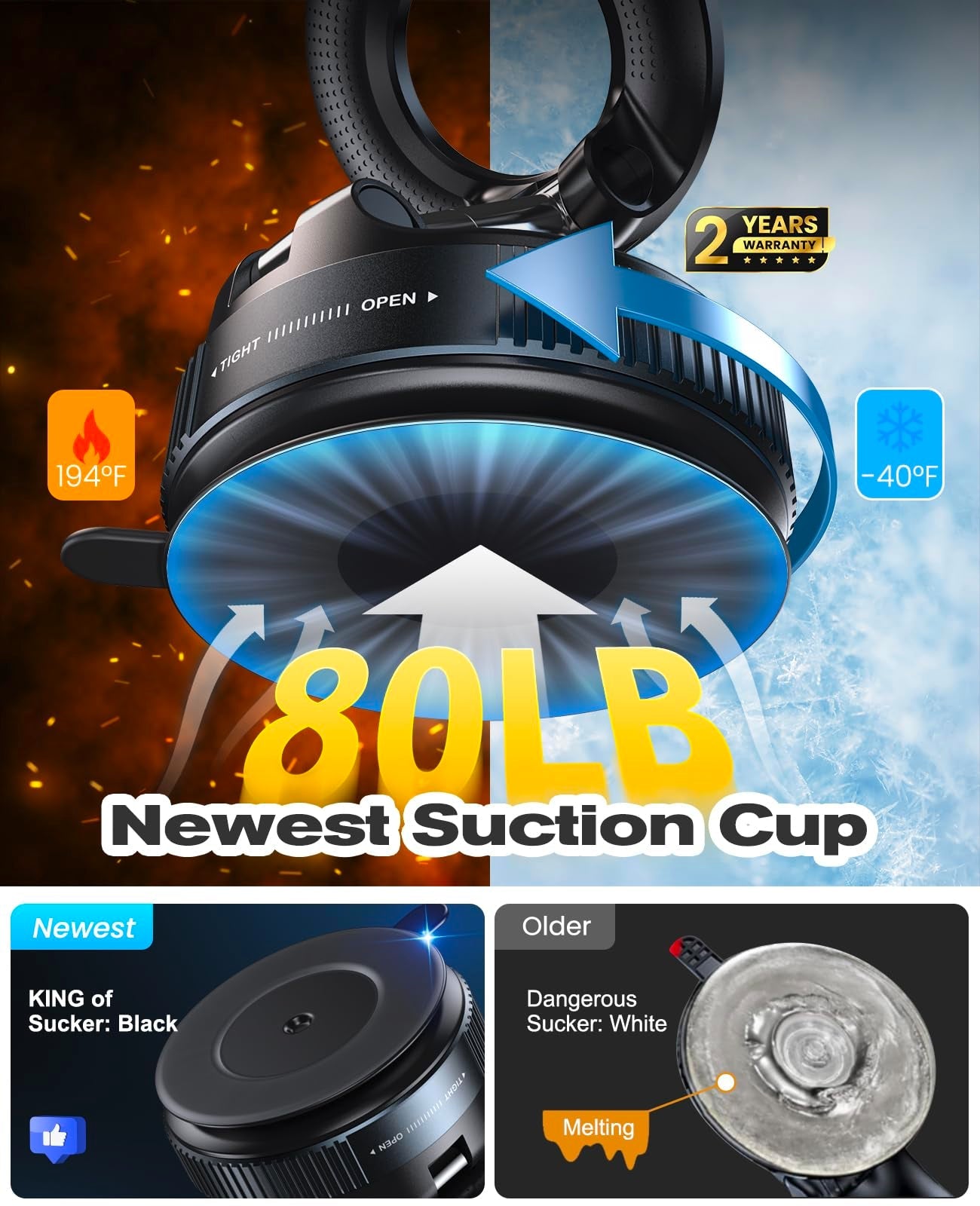 • Strong Suction & Stable Hold - This car phone mount uses advanced rotating-lock vacuum suction, boosting suction by 50% compared to traditional press-on mounts. It stays stable on bumpy roads or during sudden stops. The powerful vacuum cup supports up to 80lbs and holds firm in extreme temperatures (-40°F to 300°F). After more than 9999+ durability tests and more than 200 reinstallations, it can still maintain strong suction for long-lasting stability.