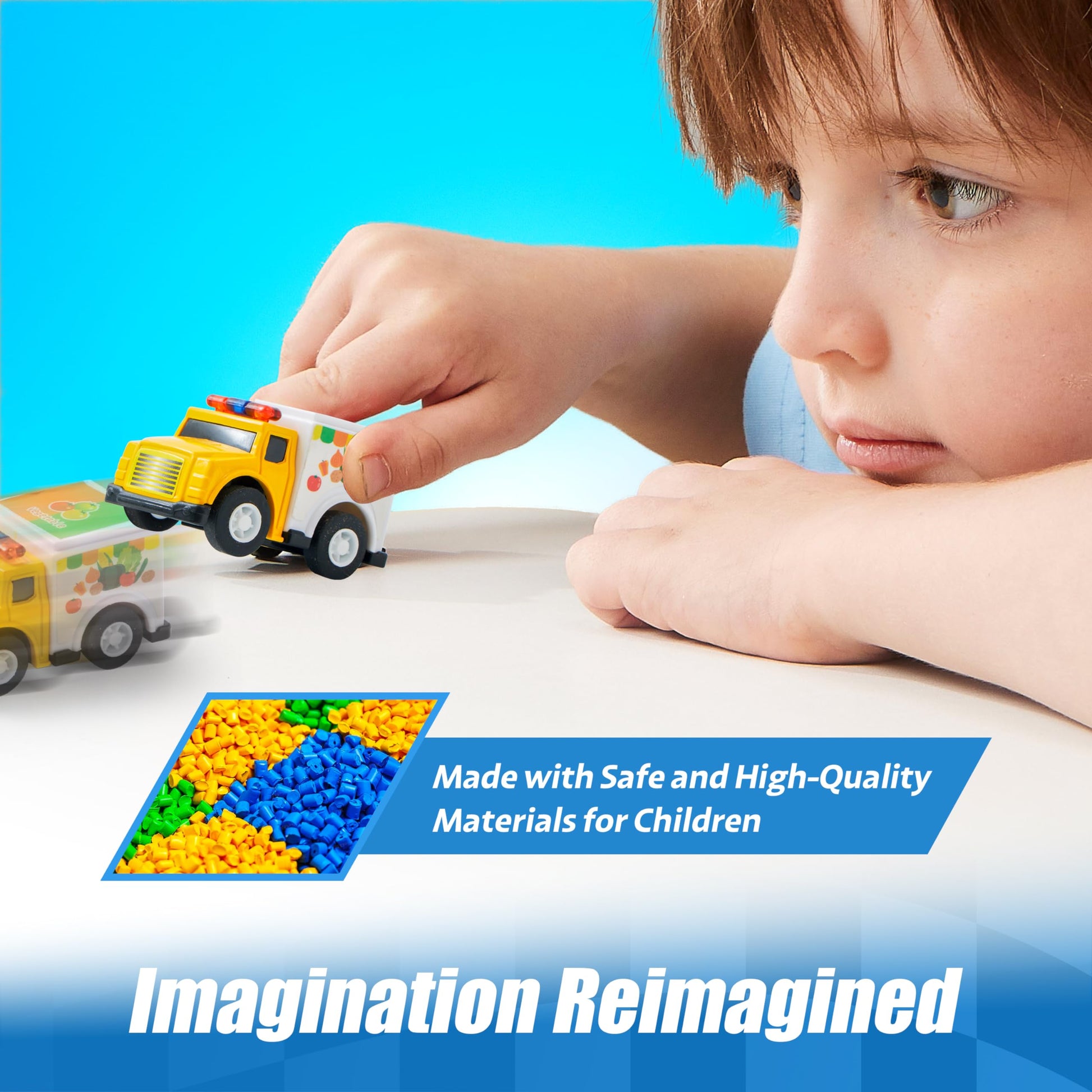 • REAL FUNCTION. Our Push-n-Go Pull Back Assorted Vehicles Toy Set for Toddlers & Kids can withstand rough use and bumps on the wall! There are no sharp edges or corners that can hurt your child. Bright and colorful. Friction powered, no battery needed. Just pull it back and let it go forward naturally, the smooth wheels can keep the car running for a long time.