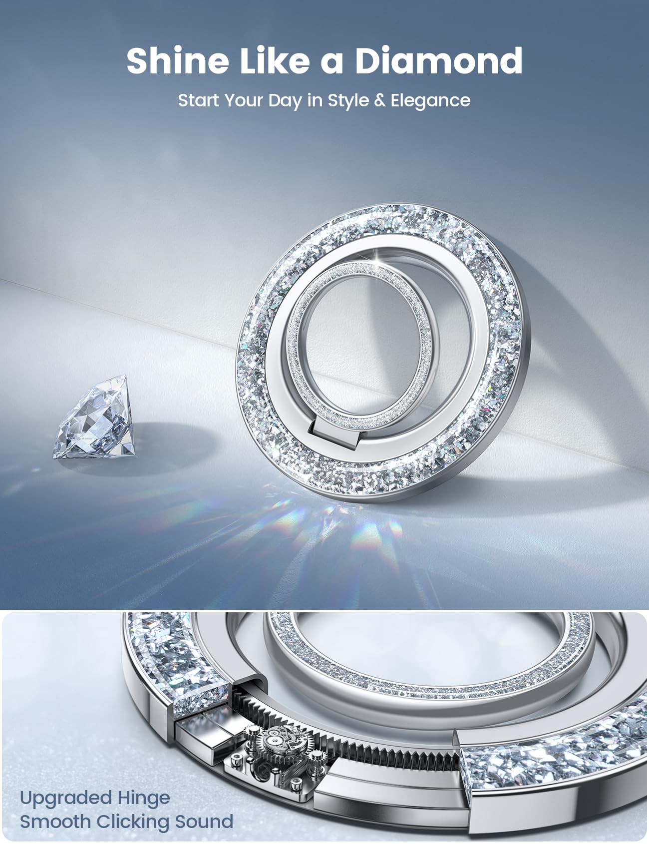 - 2025 Fashion Twinkle Ring : Lamicall 2025 newest magnetic phone ring grip makes a perfect combination of fashion and functionality. Unlike common single-color rings, our newest magnetic phone ring grip is not only a practical cell phone grip stand but also an eye-catching phone ornament. The outer ring of this mag safe grip is adorned with high-quality silver glittering materials, giving it a diamond-like shine that adds a touch of glamour to your mobile phone. A good gift for your wife, daughter, mother, aunt, families, girlfriend, friends, yourself