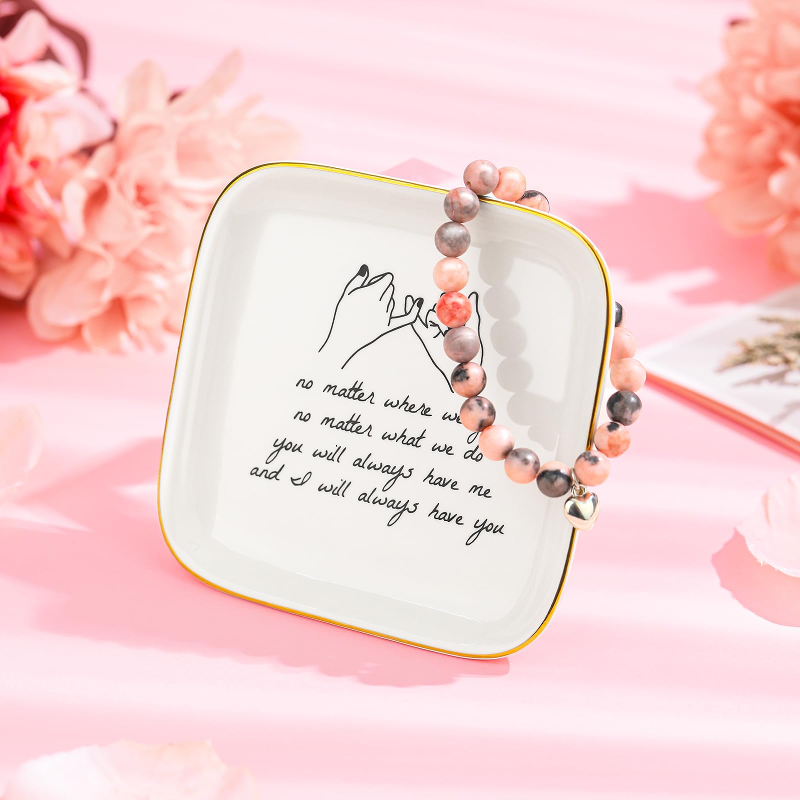 - Reliable Quality and Premium Products: The makeup bag is made of high-quality linen cotton fabric, durable, and fashionable. The patterns on the coffee cup are all unique, symbolizing the special friendship between you two. The keychain is made of 316L stainless steel, never rusting, staining, or fading. The beaded bracelet uses natural gemstones, not easily damaged, suitable for most wrists. The jewelry tray is made of high-quality glazed ceramic, with a smooth surface and a stylish golden fram