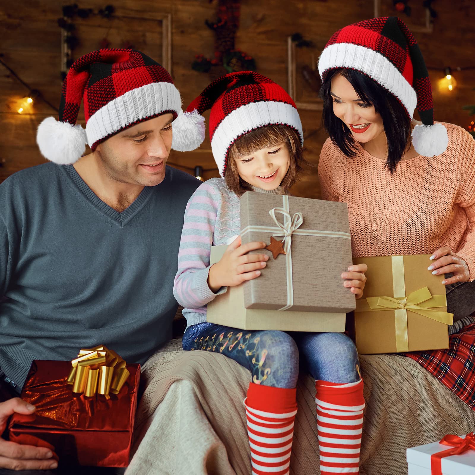 Loopeer 3 Pieces Christmas Hats Christmas Knitted Caps Winter Warm Beanie Plaid Hats with Pom Pom Santa(Red, Black)
