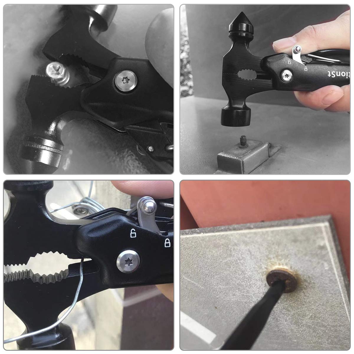 - Essential Safety Gadget:hammer multitool come with a hammer and other side is window breaker tool ,the end is all in one tool kit help you which survival situations.We all travel with family and friends. So to protect them get this multi-tool with the built in life hammer.