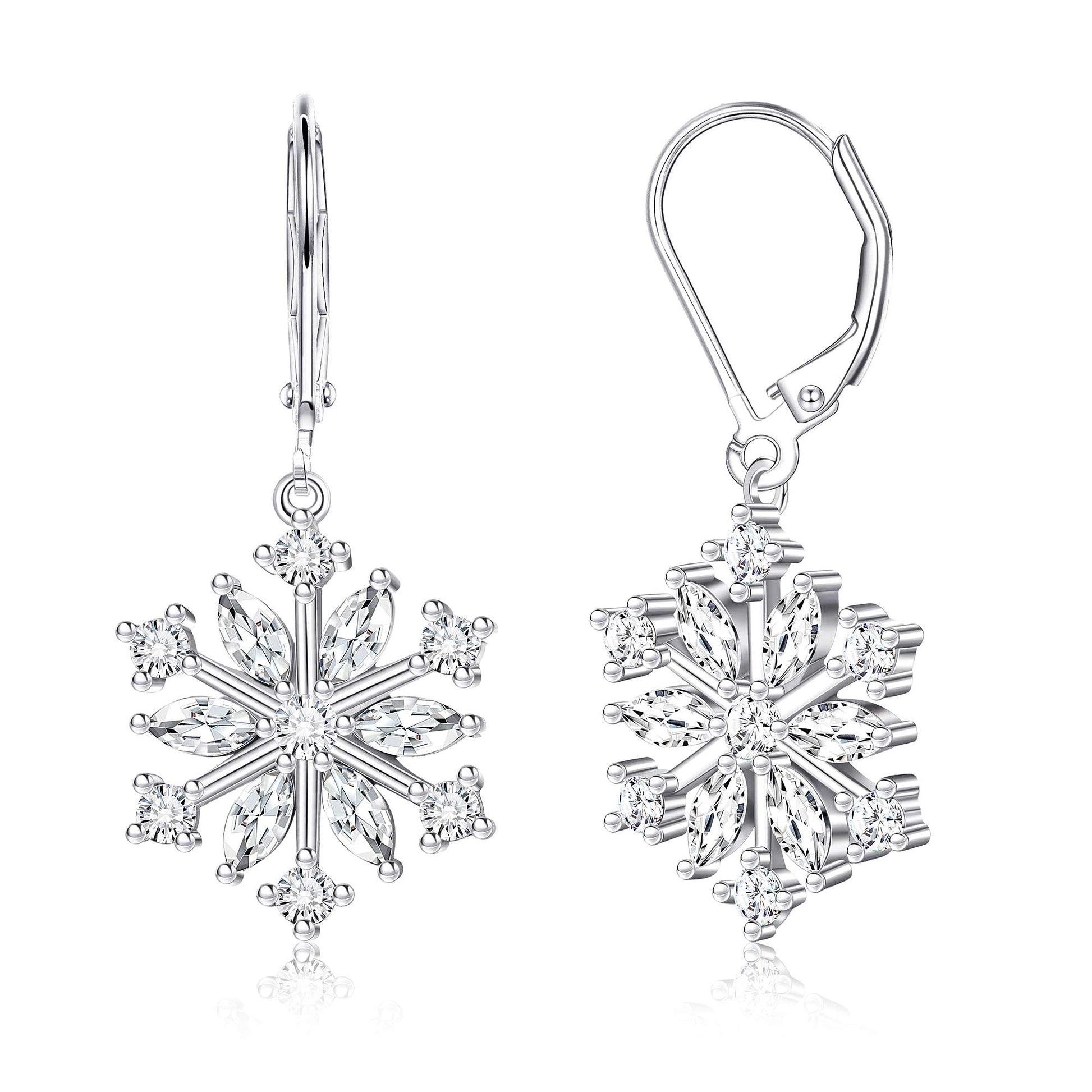 - Sterling Silver Snowflake Earrings : Snowflake Drop Earrings Are Crafted From The Highest Grade and Authentic 925 Sterling Silver, Nickel-Free, Lead-Free, Cadmium-Free, Hypoallergenic For Sensitive Skin. White Gold Plating Gives A Bright, Shiny, Long-Lasting Silver-Colored Finish To A Piece